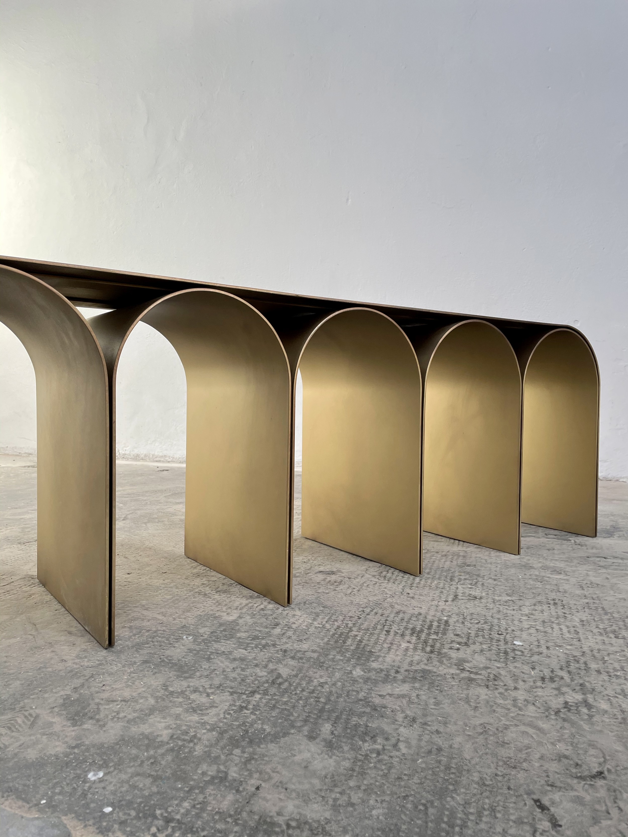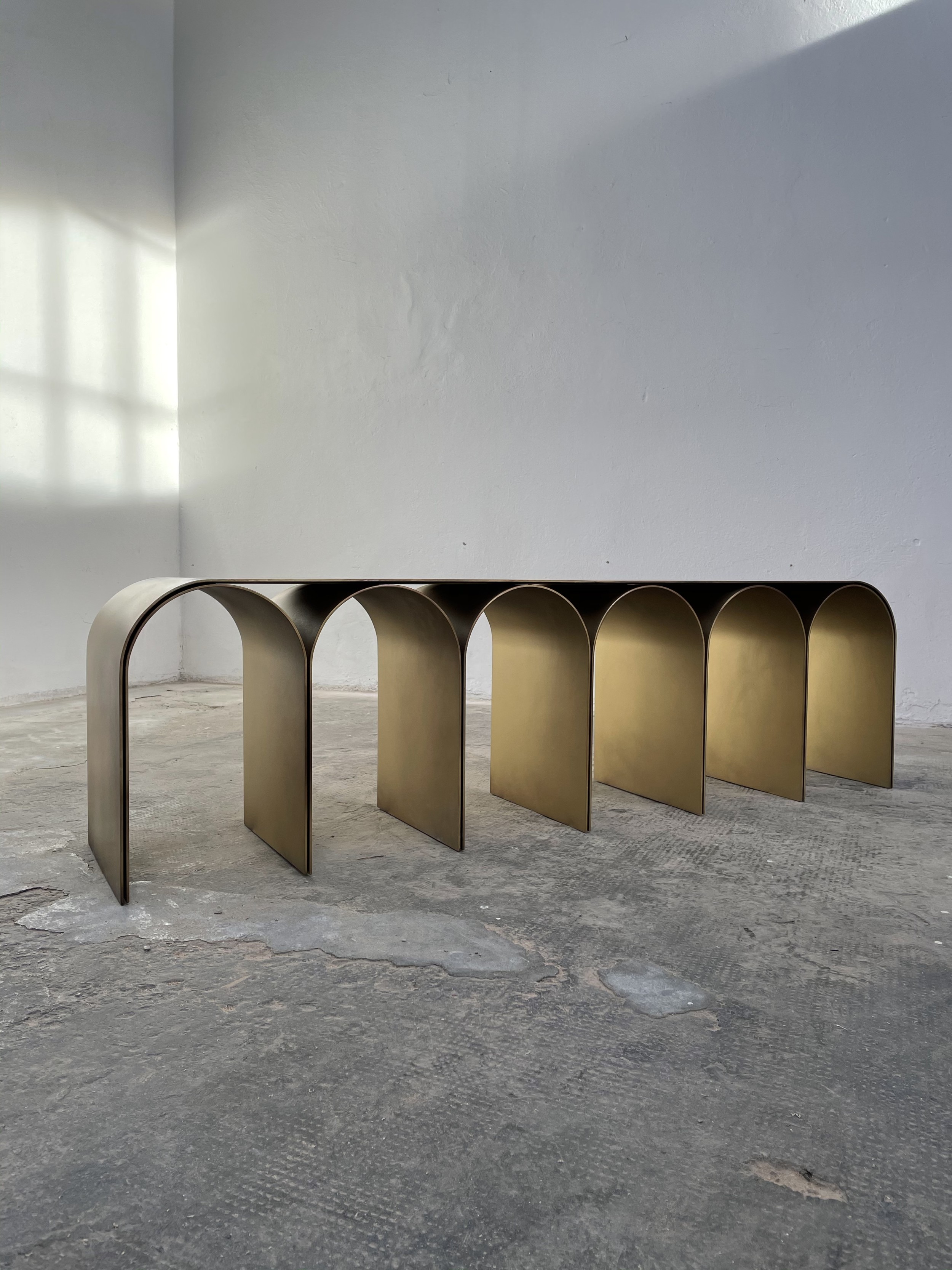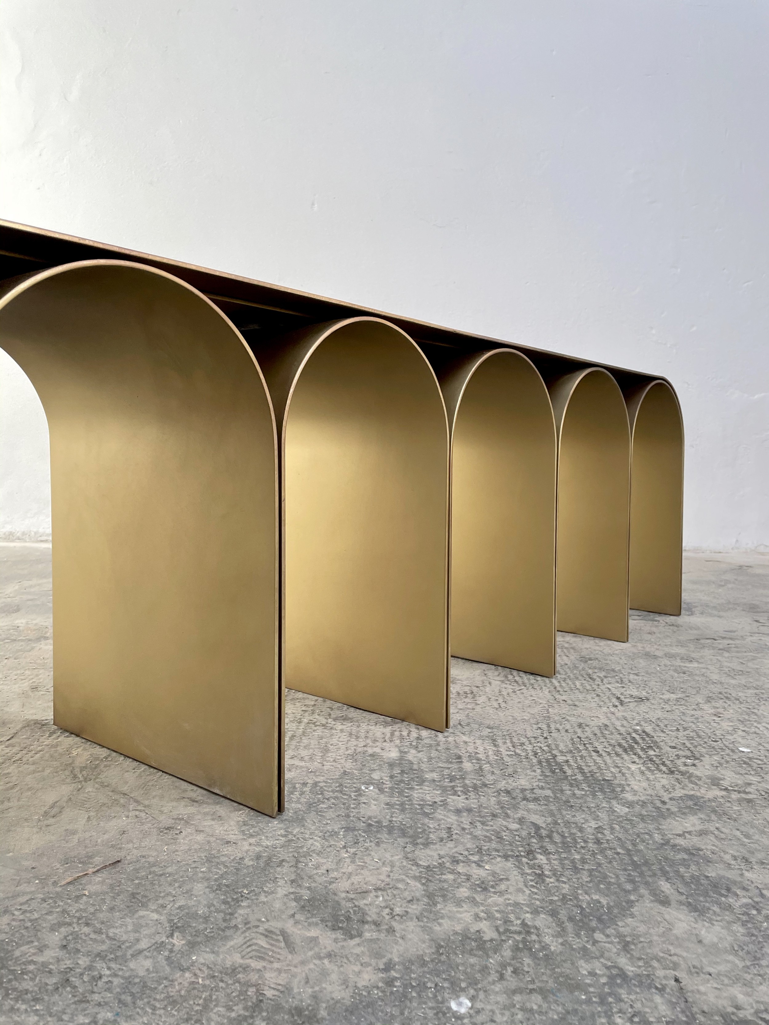 Contemporary steel gold arch 7-leg bench with a repetition of arch motifs in a hand-applied brass finish (PIETRO FRANCESHINI)