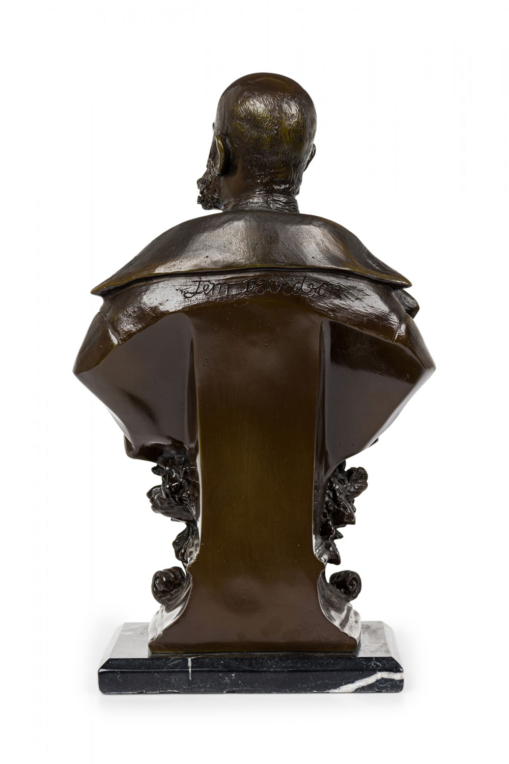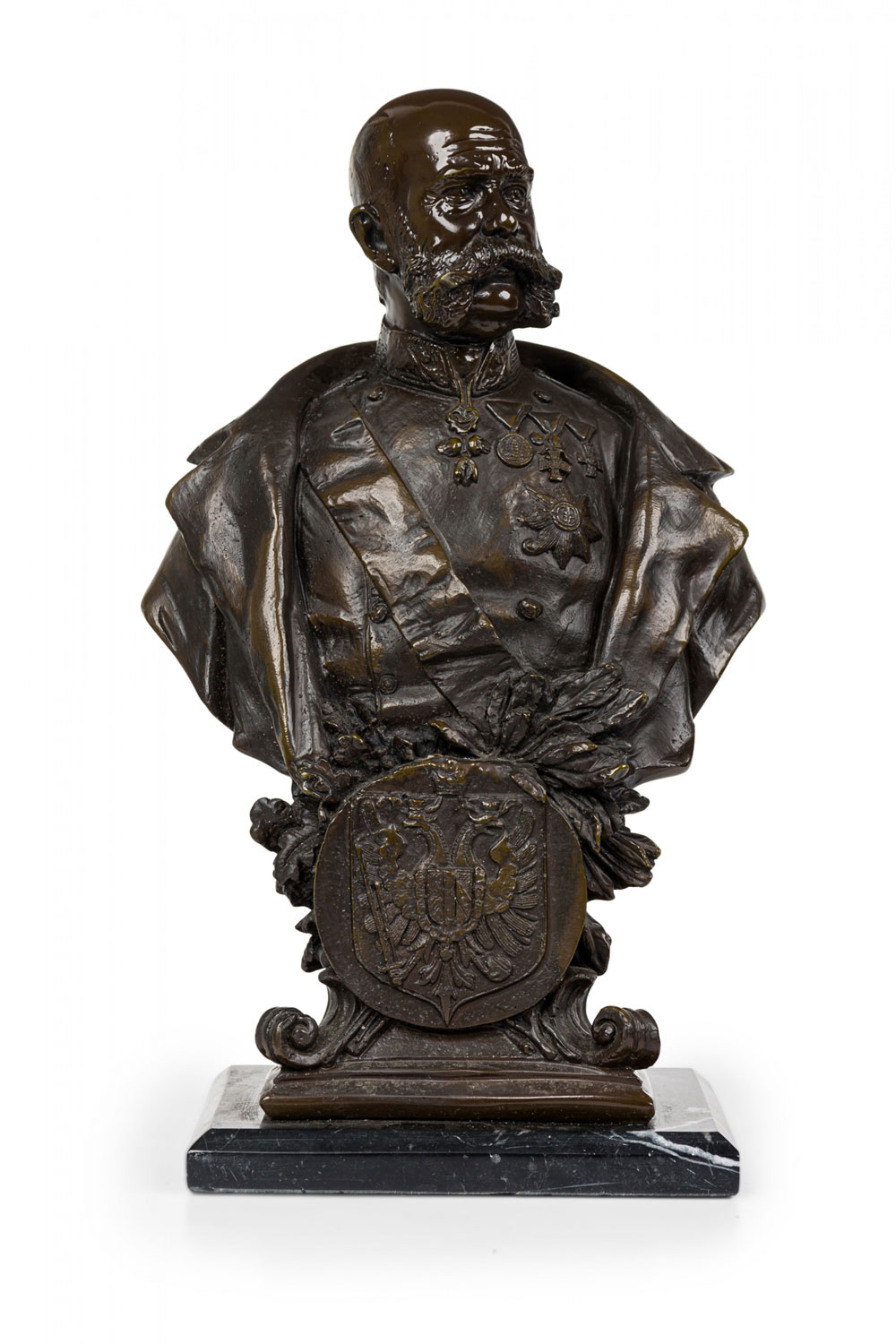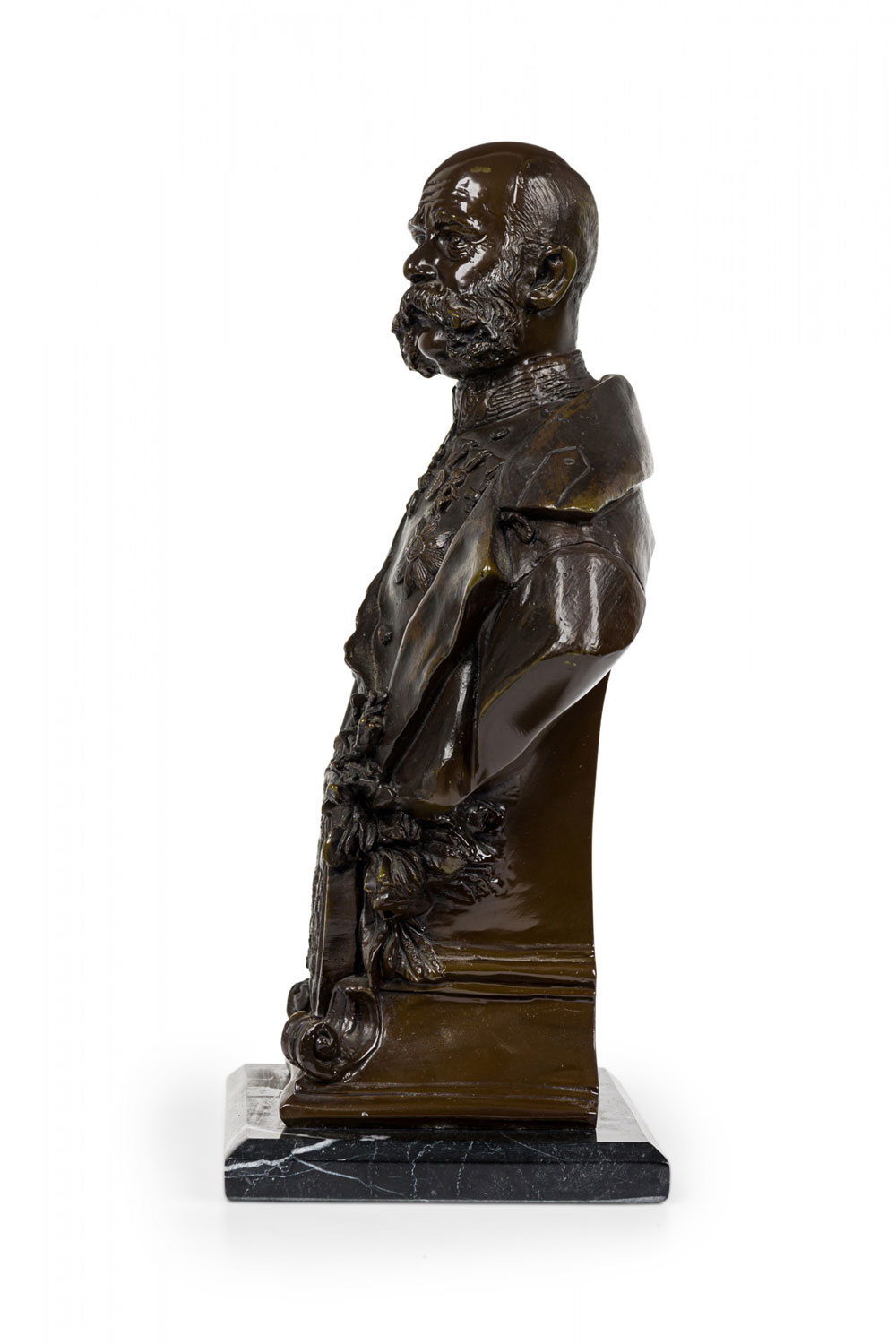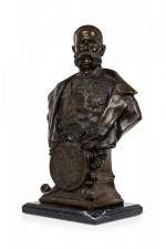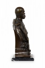 Continental German (19/20th Century) bronze bust depicting a dignitary / military officer with prominent mustache, wearing several medals, mounted on a beveled black marble rectangular plinth. (Signed "Jem Davidson" on the back shoulder)..