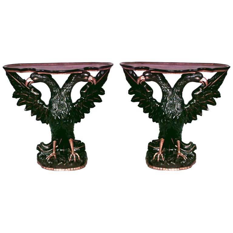 PAIR of Continental Austrian/Hungarian (19th Century) double eagle gilt and dark green carved console tables with shaped burl wood top. (PRICED AS PAIR).