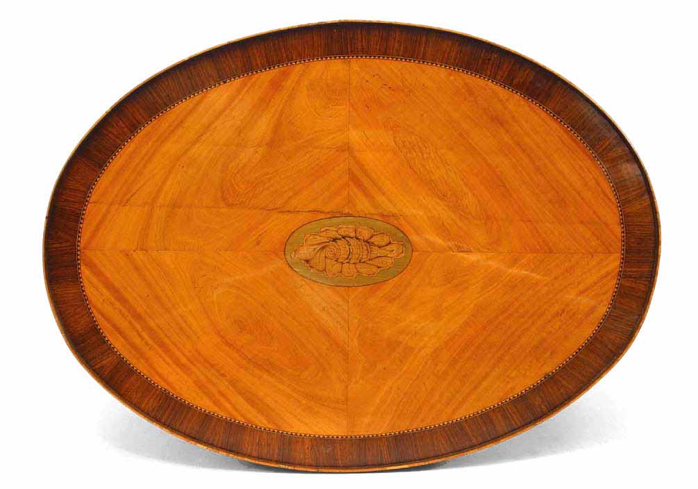 Continental Dutch (18/19th Century) oval satinwood and rosewood inlaid 4 legged center table with gallery and inlaid medallion center..