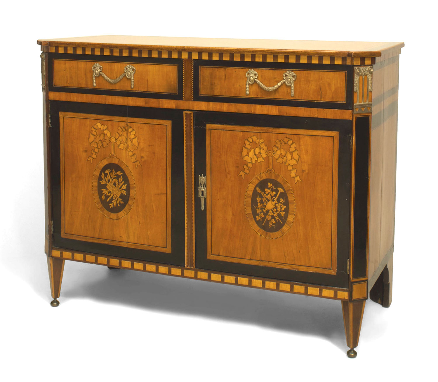 Continental Dutch (18th/19th Century) satinwood commode cabinet with 2 drawers above to doors with floral marquetry panels..