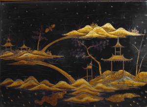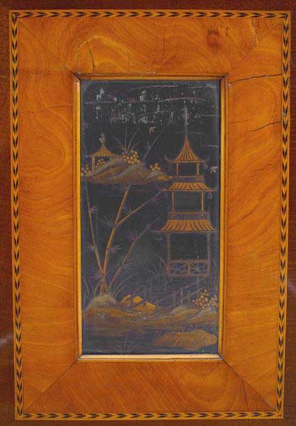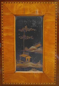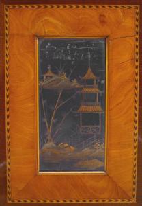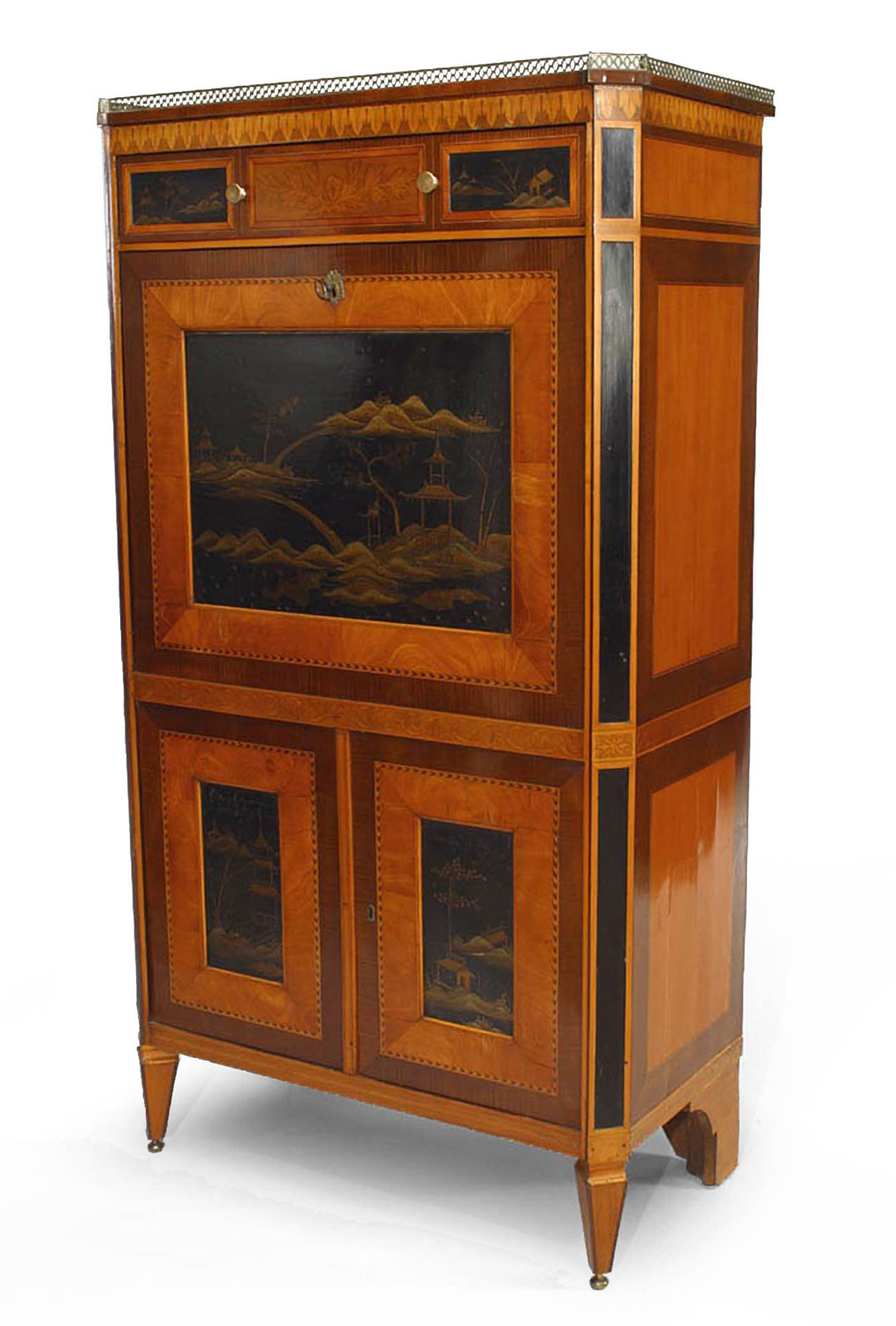 Continental Dutch-style (18/19th Century) satinwood and inlaid trimmed drop front desk with chinoiserie decorated lacquered panels and brass gallery