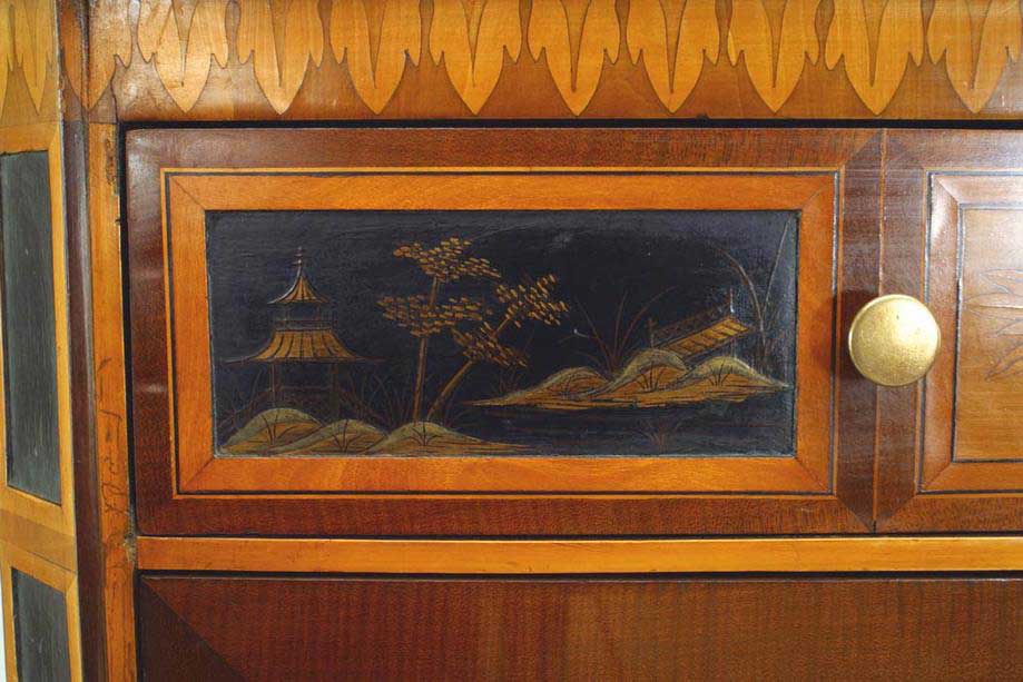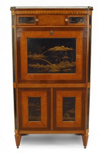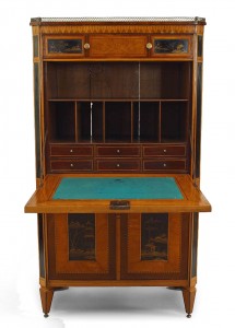 Style: Continental Materials & Techniques: Wood, brass, satinwood, inlaid Category: Cabinets & Case Goods, Office/Library