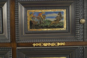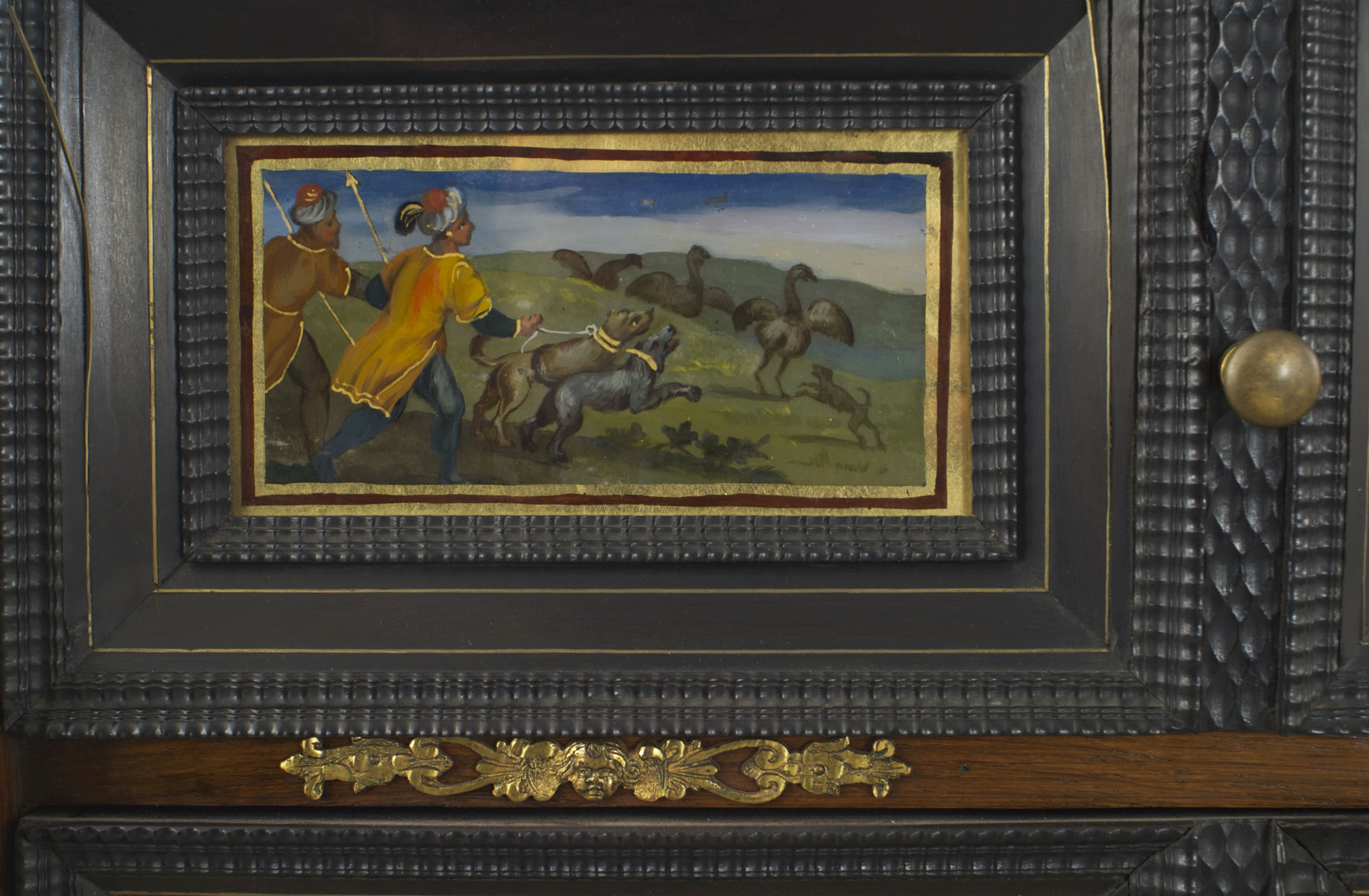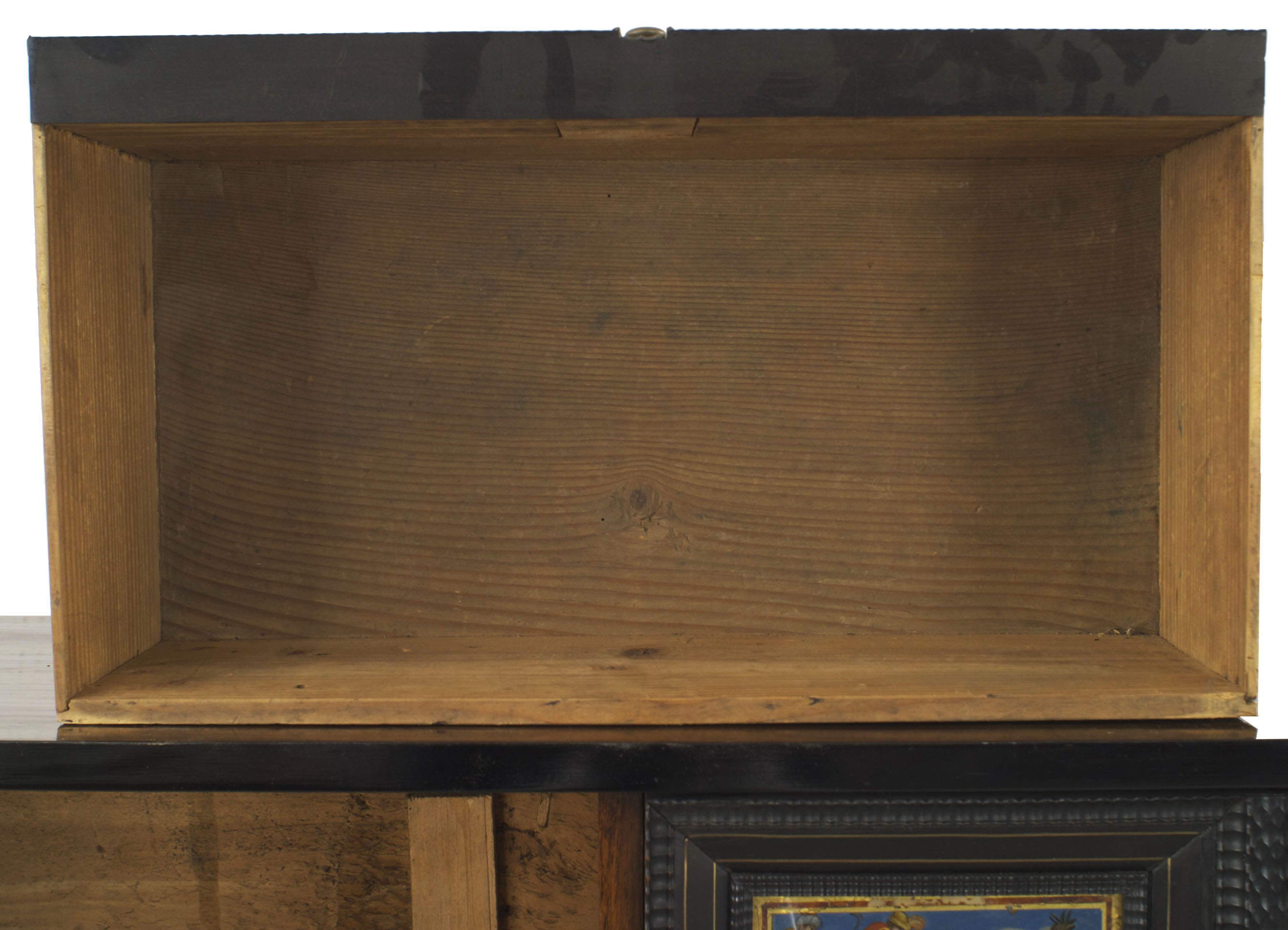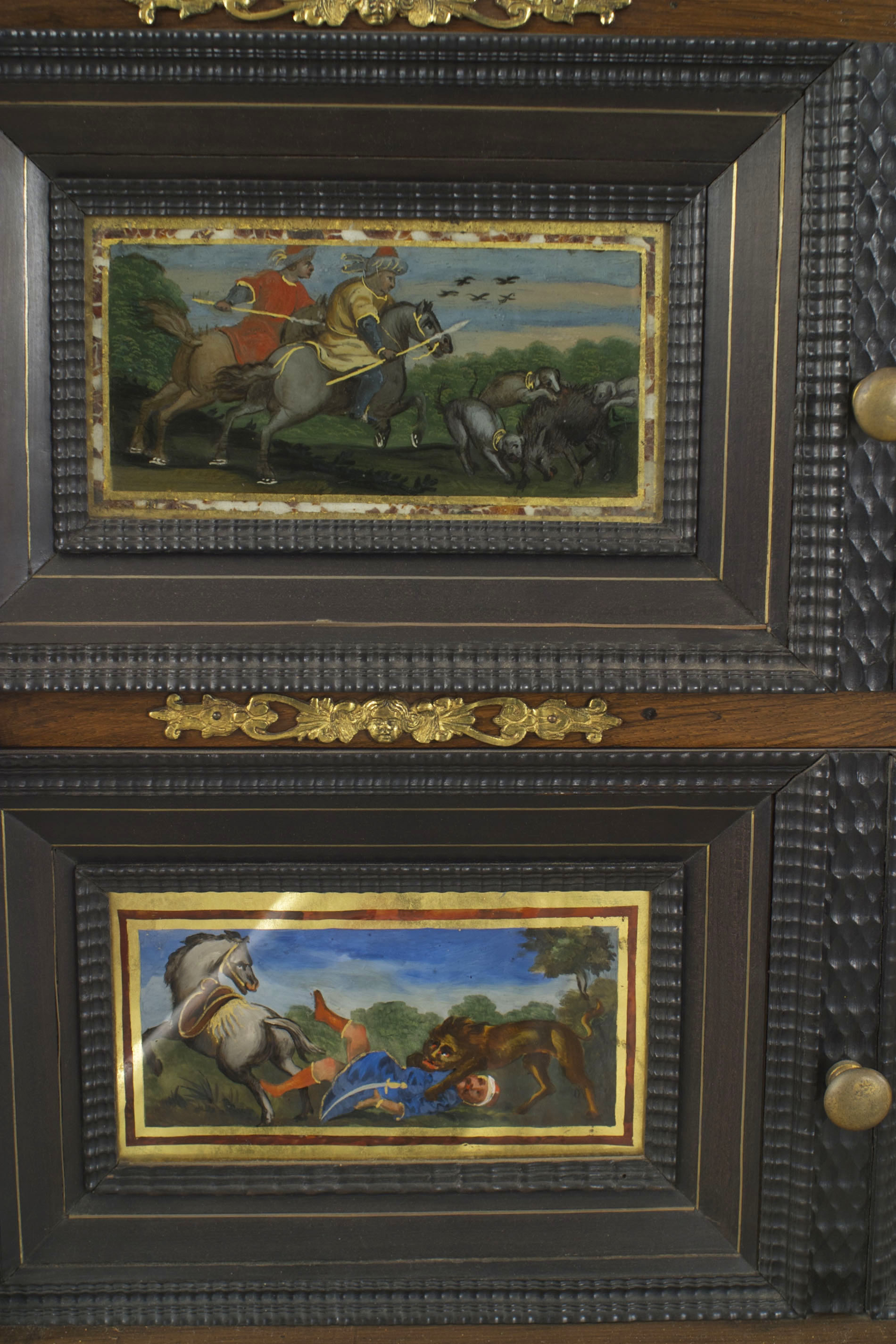 Continental (possibly Flemish 19/20th Century) ebonized cabinet with a series of reverse painted on glass panels on 6 drawers raised on claw feet (Related Item: PPF077A)