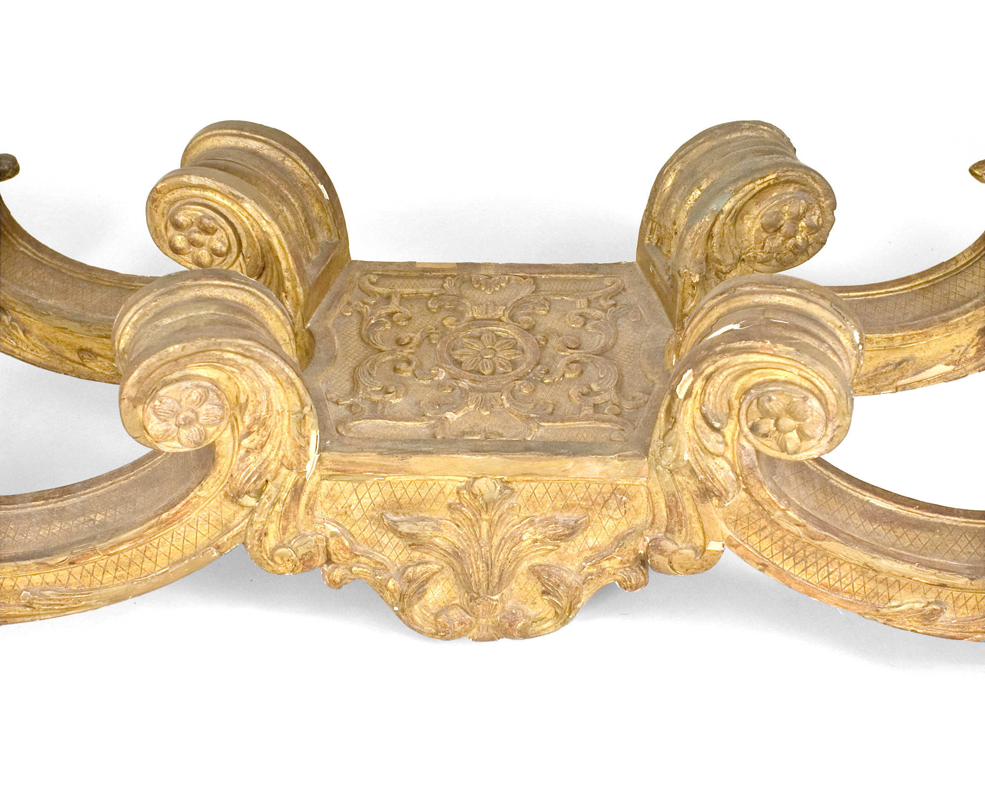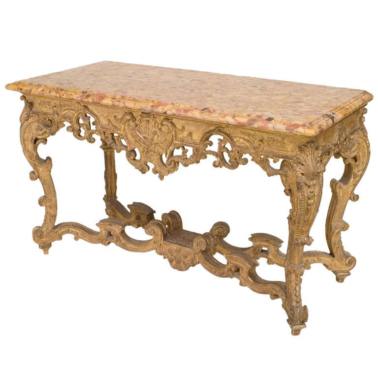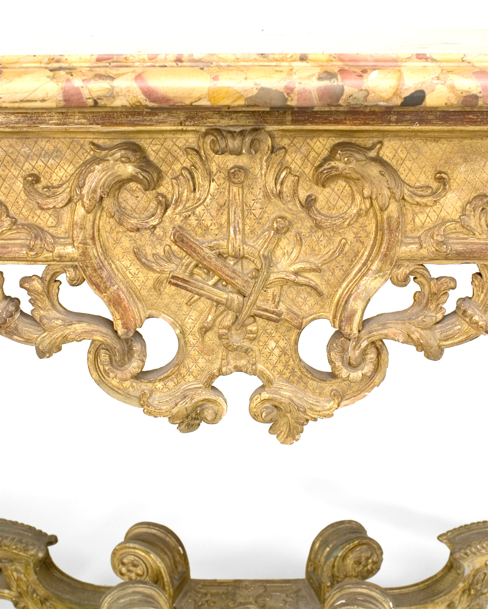 Continental (Possibly German 18/19th Century) gilt rectangular console table with a carved and filigree apron and stretcher connected with 4 scrolls & breche stepped up marble top..