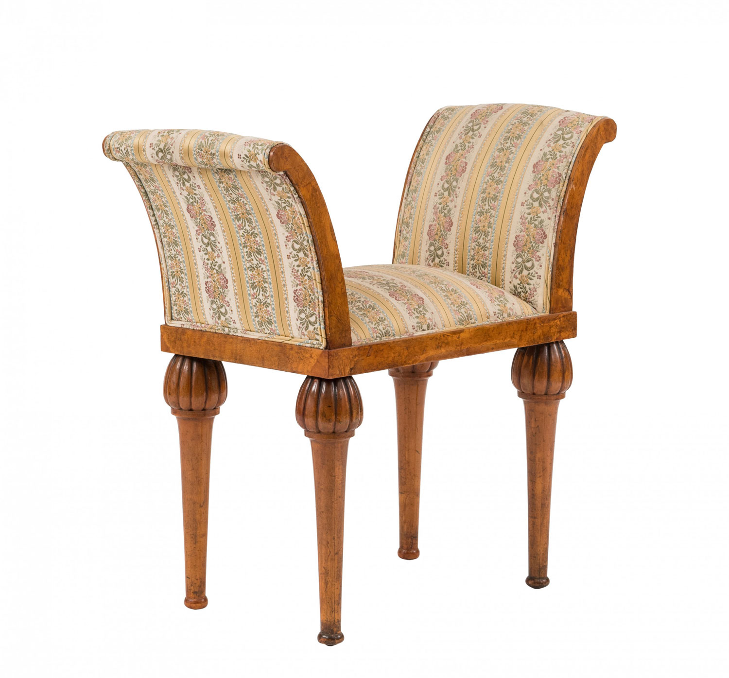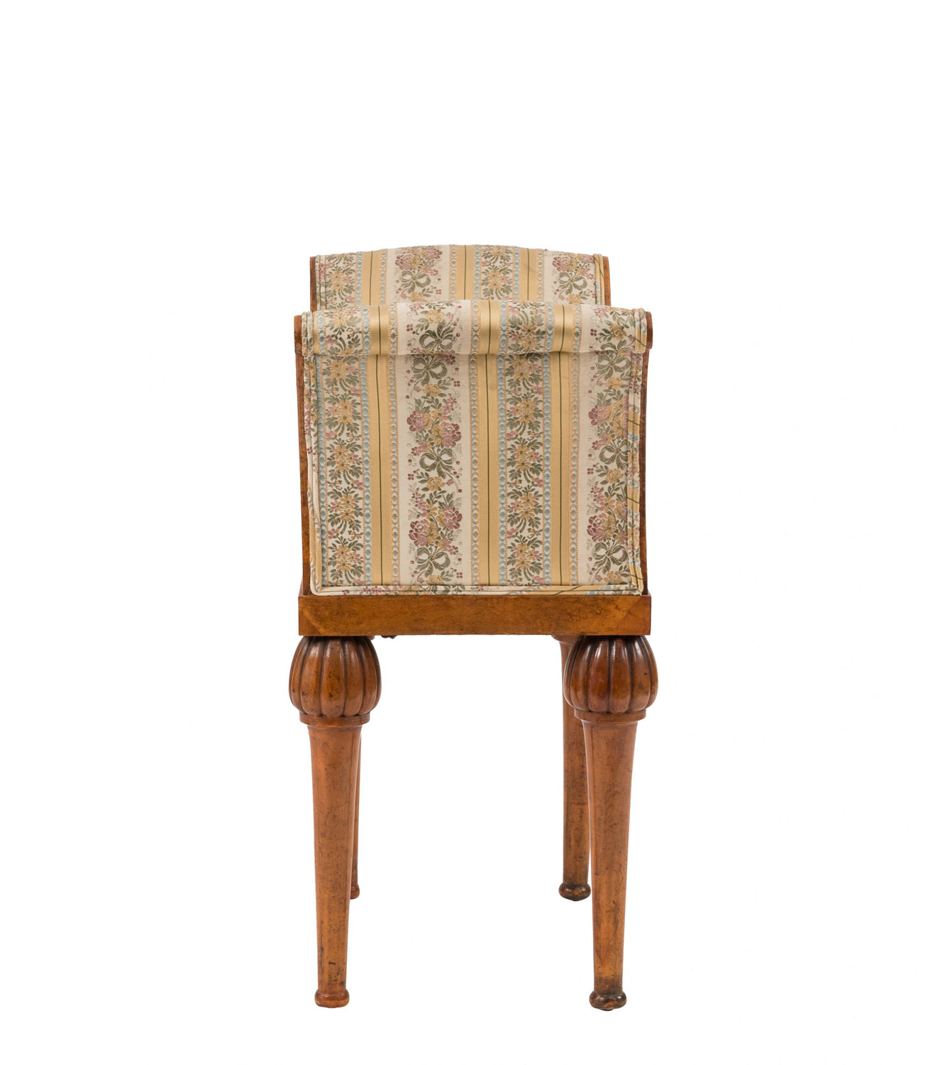 Continental Neoclassic (Possibly Russian, mid 19th Century) karelian birch and fruitwood bench with flaired arms and tapered legs..