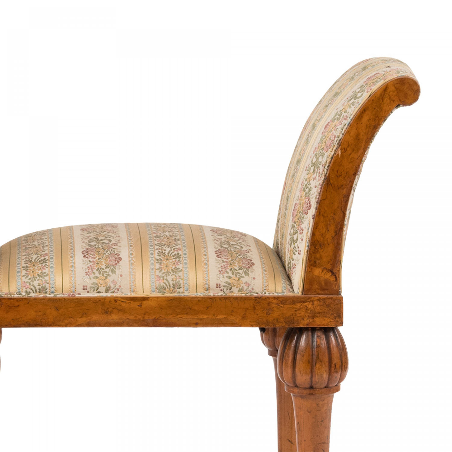 Continental Neoclassic (Possibly Russian, mid 19th Century) karelian birch and fruitwood bench with flaired arms and tapered legs.