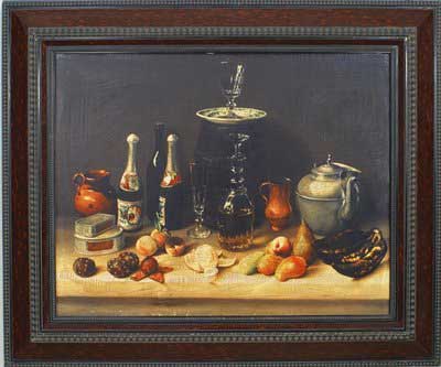 Copy of a Dutch Flemish still life painting showing fruits, wine and tinned goods on a table