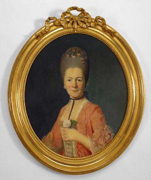 Copy of portrait painting of a French woman in gown holding rose, in gold oval frame- (Companion to TR2005).