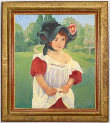 Copy of a portrait painting titled "Margot Standing in A Garden" Depicting a young girl in a red dress with a flower in her floppy hat.
