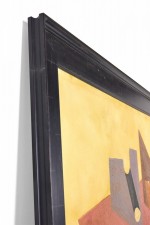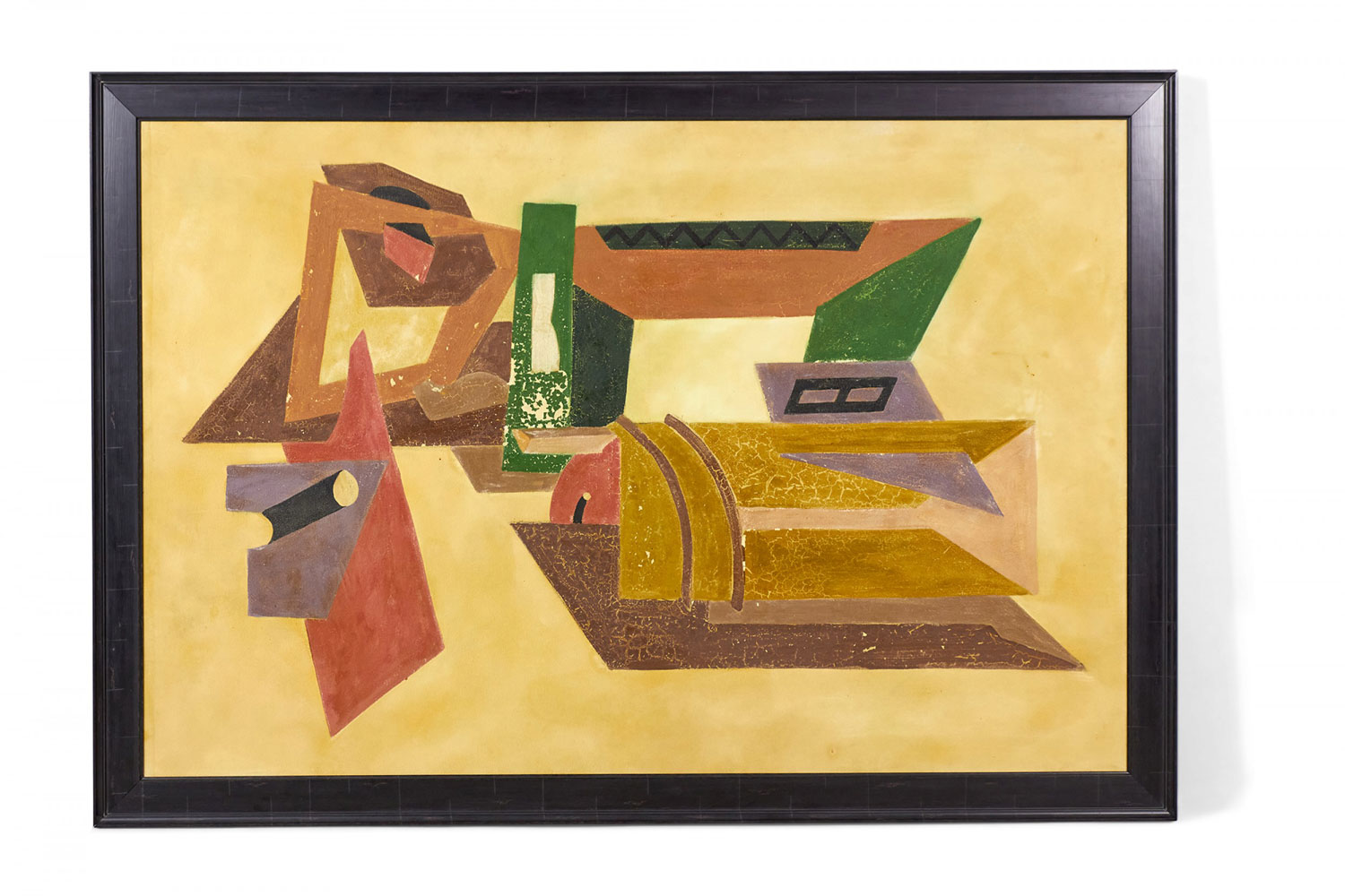 Copy of Modern Abstract Cubist style painting showing architectural planes in green, blue, ochre, purple, brown and black on a beige field in a thick black frame