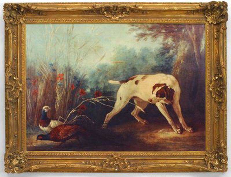 Copy of a wildlife painting titled "Flushing Pheasants" depicting a bird dog with a pair of pheasants.