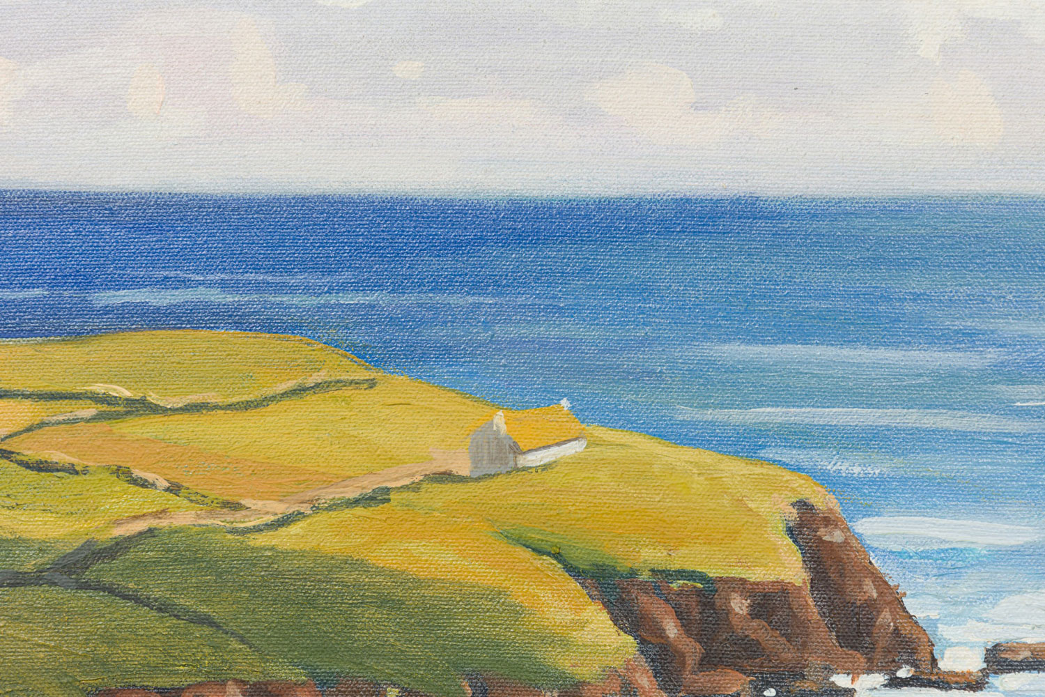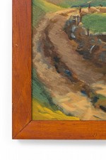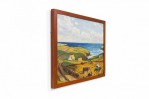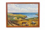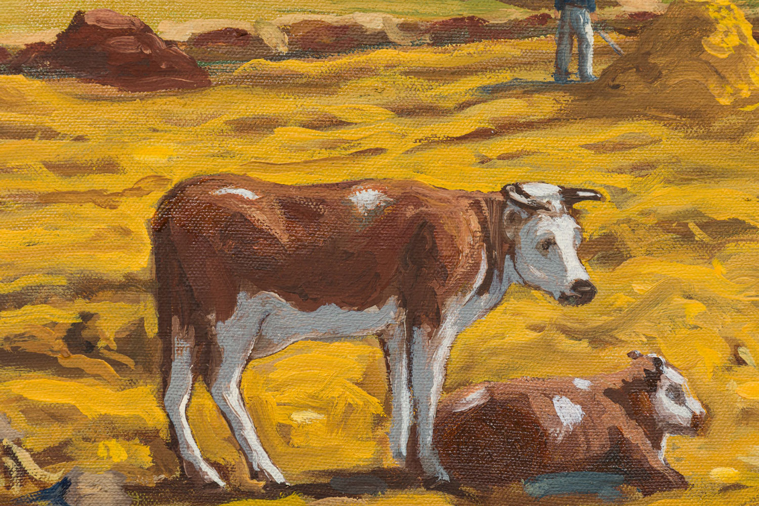 Copy of Impressionist landscape painting showing cows and farmer in stone wall fenced pasture