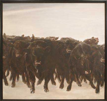 Copy of a painting by Jamie Wyeth titled "Angus" showing a herd of Black Angus in the snow..