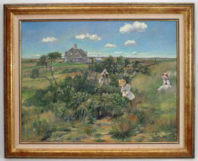 Copy of an impressionist landscape painting titled "Blueberry Bush" showing three Victorian girls in summer picking berries