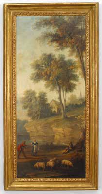 Copy of a vertical landscape painting showing sheep with three people in foreground, house on hill