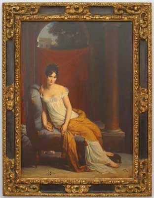 Copy of a French painting of a lady seated on a small recamier in gilt carved trimmed and black painted frame titled "Portrait of Madame Recamier 1802"
