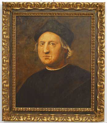 Copy of a portrait painting of the Spanish explorer Columbus in Black cape and coat.