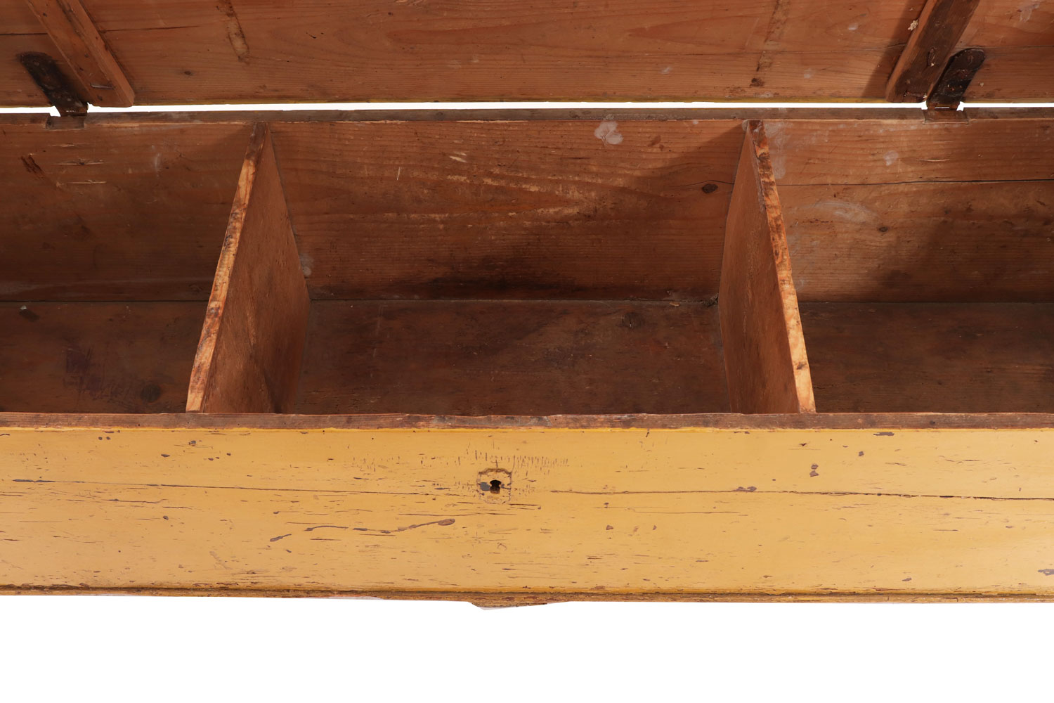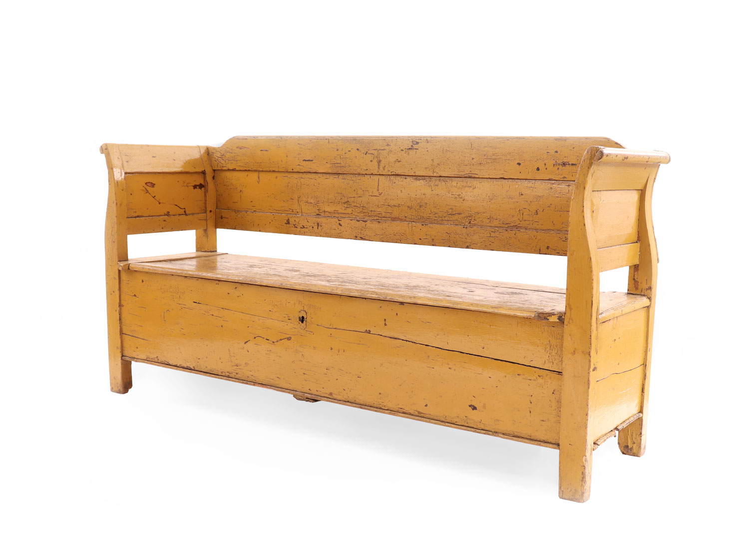 Rustic American Country style (probably Canadian, 19th Century) yellow painted 3 seat wooden bench with a lift top box base and raised plank back rest and sides..