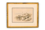English Georgian (1st half 19th Century) gilt framed colored lithograph of a group of Moorish men on a hillside by ancient damaged stone pillars (titled: Ruins Called Om El Hamed Near Tyre April 25, 1839) (DAVID ROBERTS) (companion to REG9009)