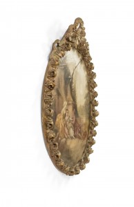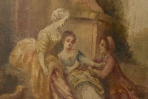 French white painted and gilt framed oval oil painting of ladies in garden (DuBois) (19th Cent.)