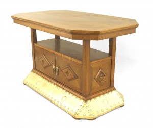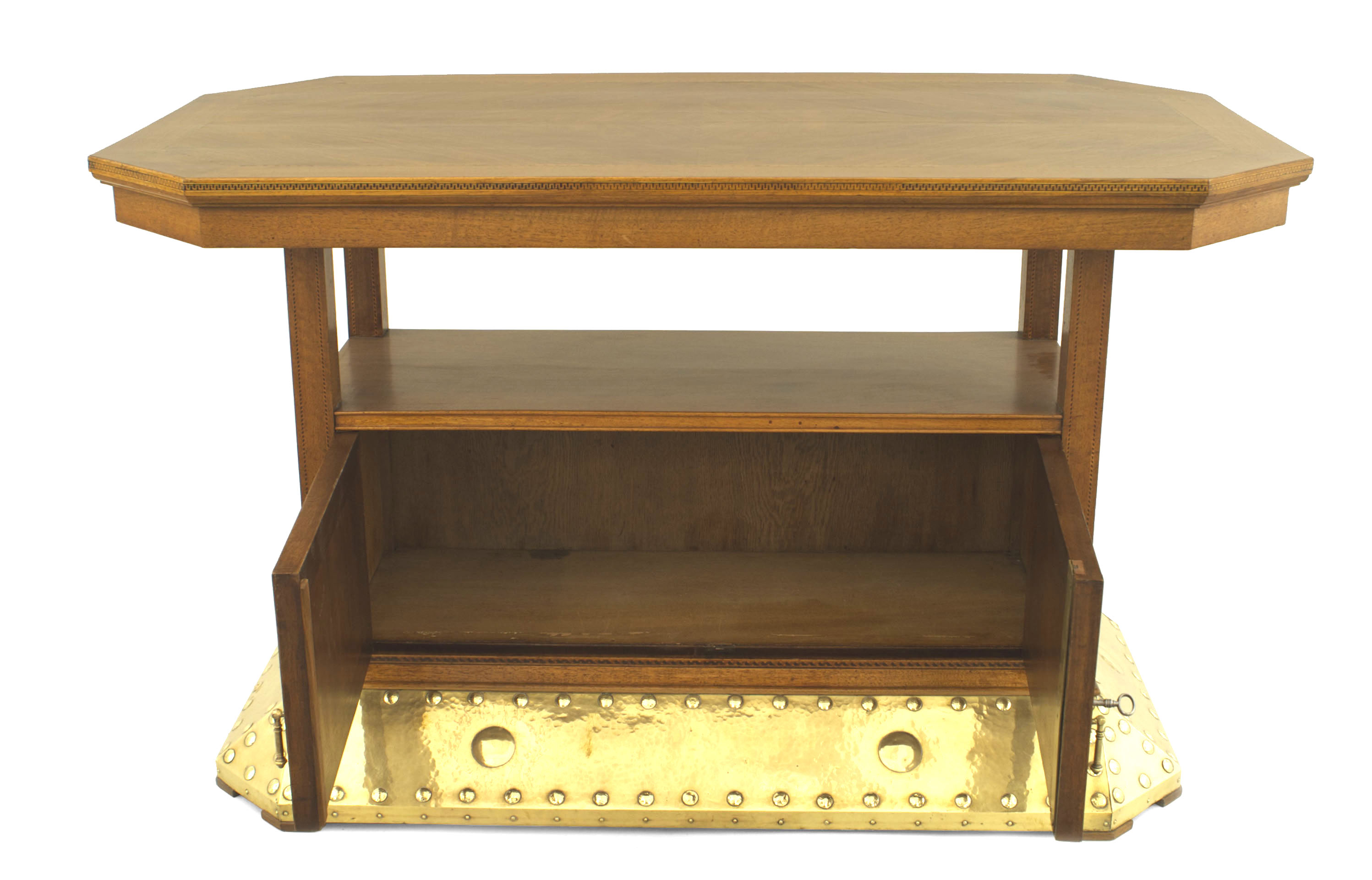 Continental Dutch Arts & Crafts walnut and oak rectangular center table with banded inlaid trim and a bottom shelf over 2 doors with diamond design resting on a flared brass trimmed base.