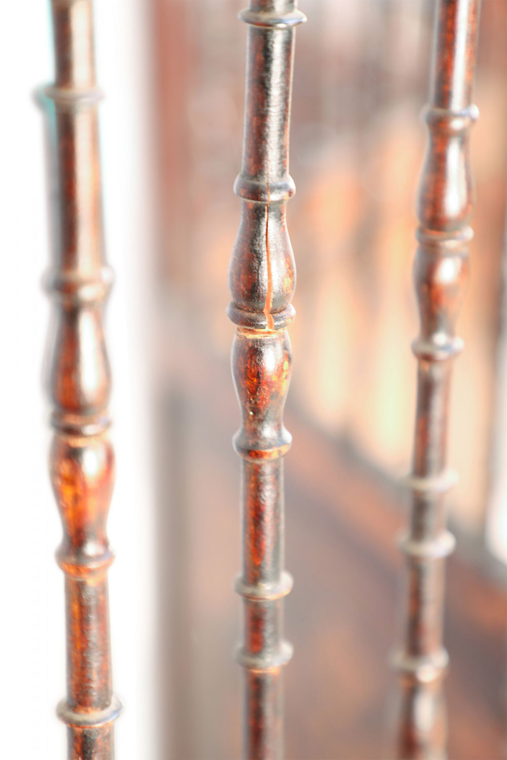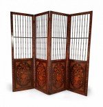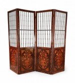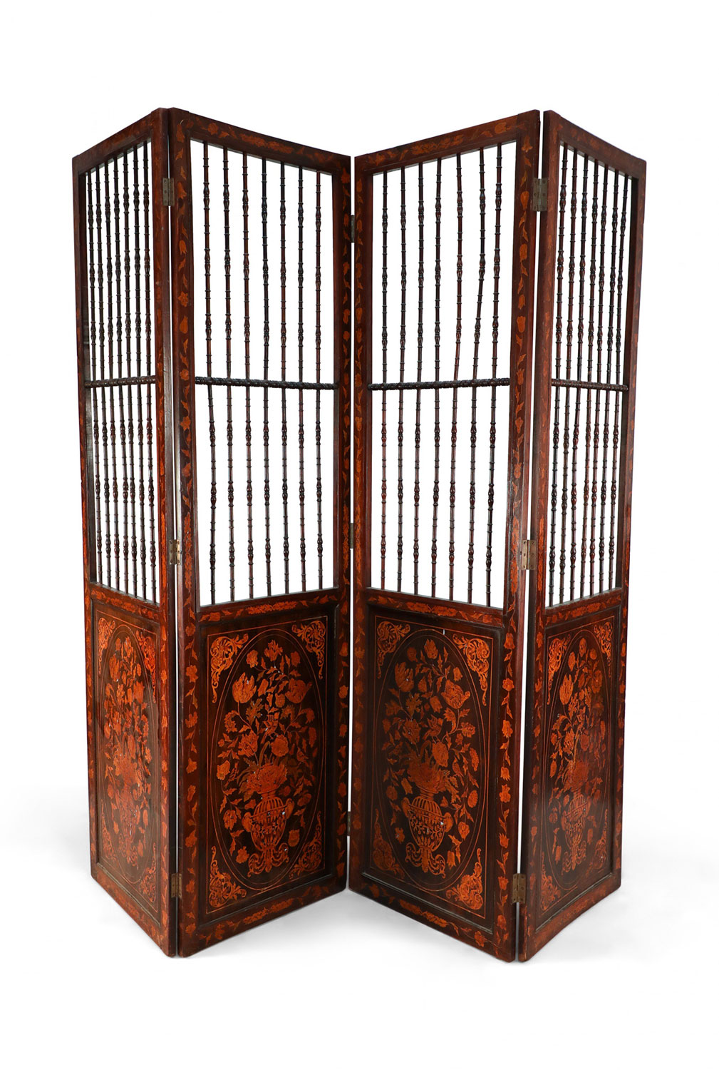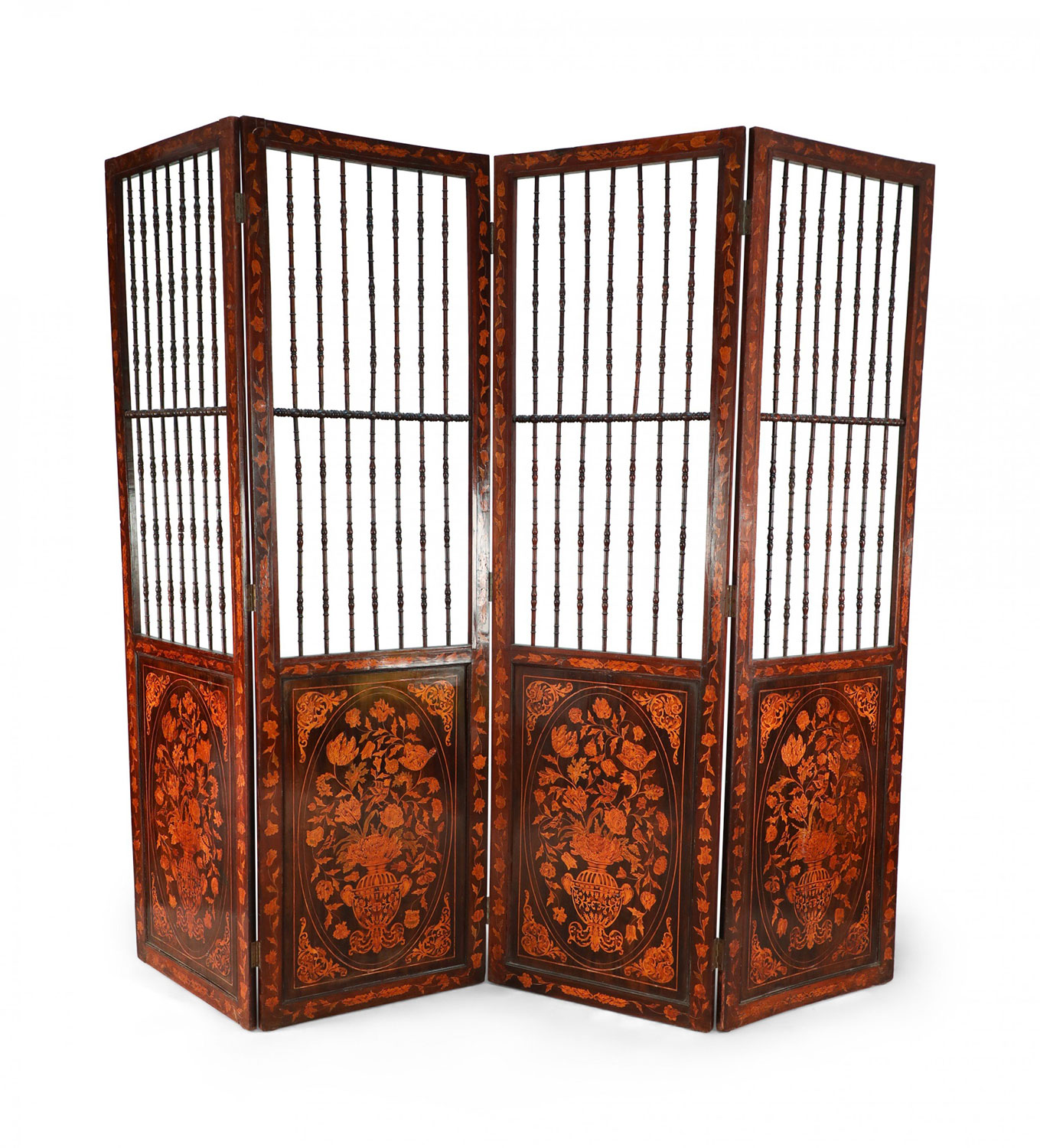 Continental Dutch style (19th Century) inlaid floral marquetry 4 fold screen with spindle design top section.