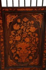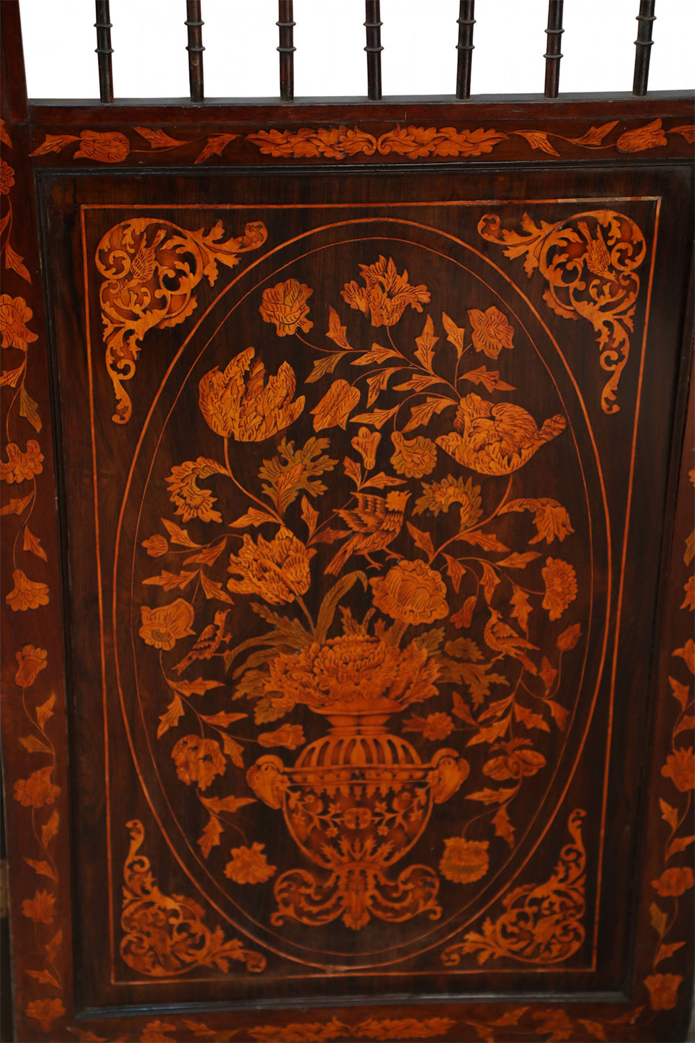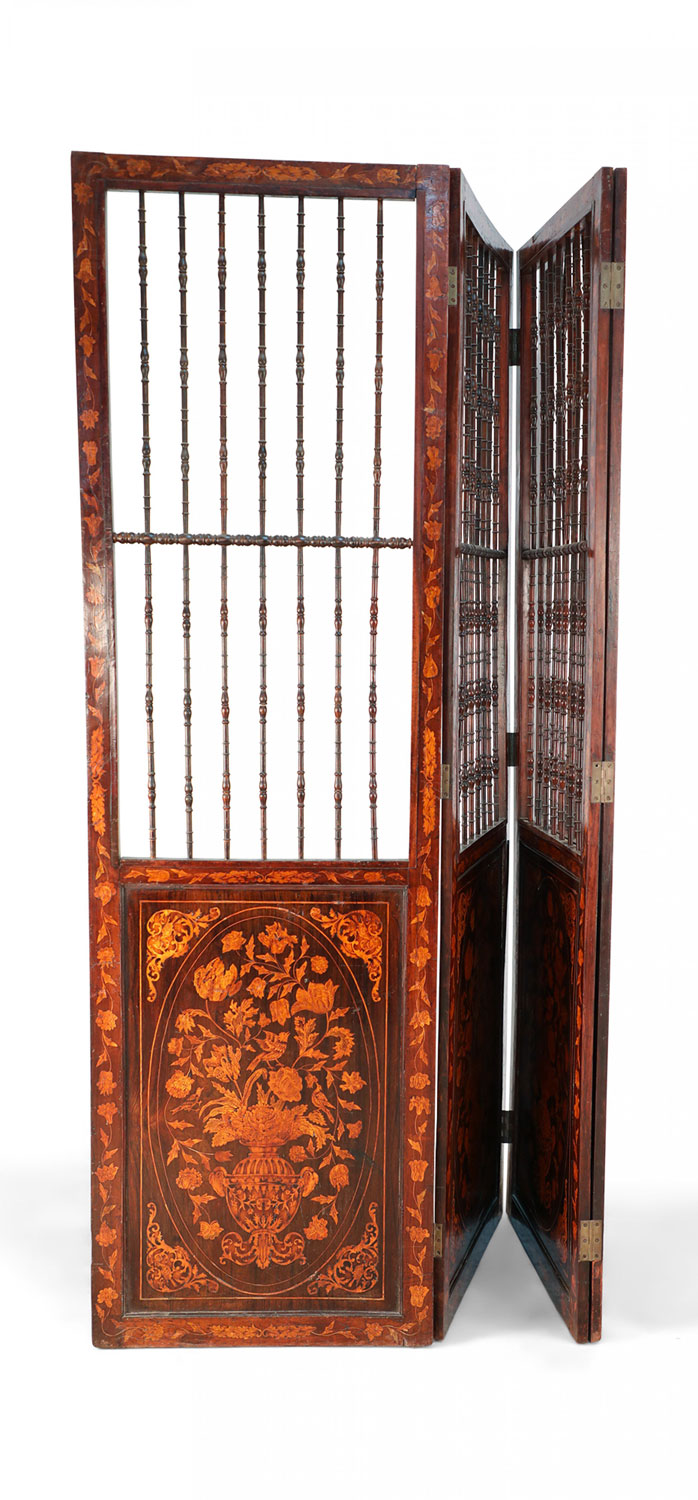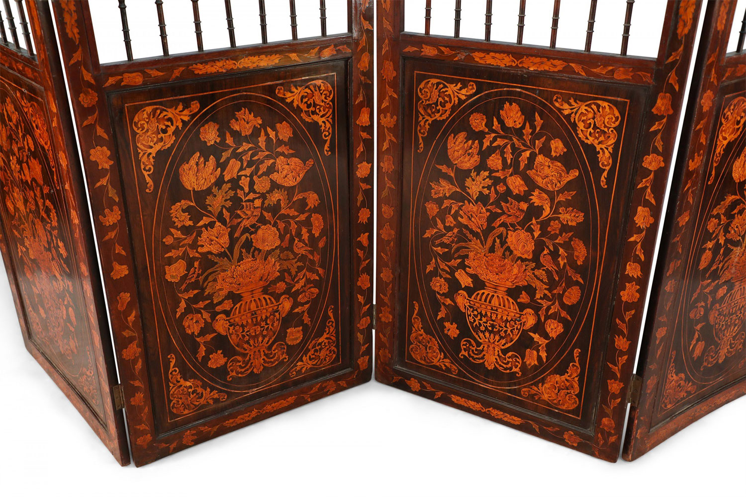 Continental Dutch style (19th Century) inlaid floral marquetry 4 fold screen with spindle design top section..
