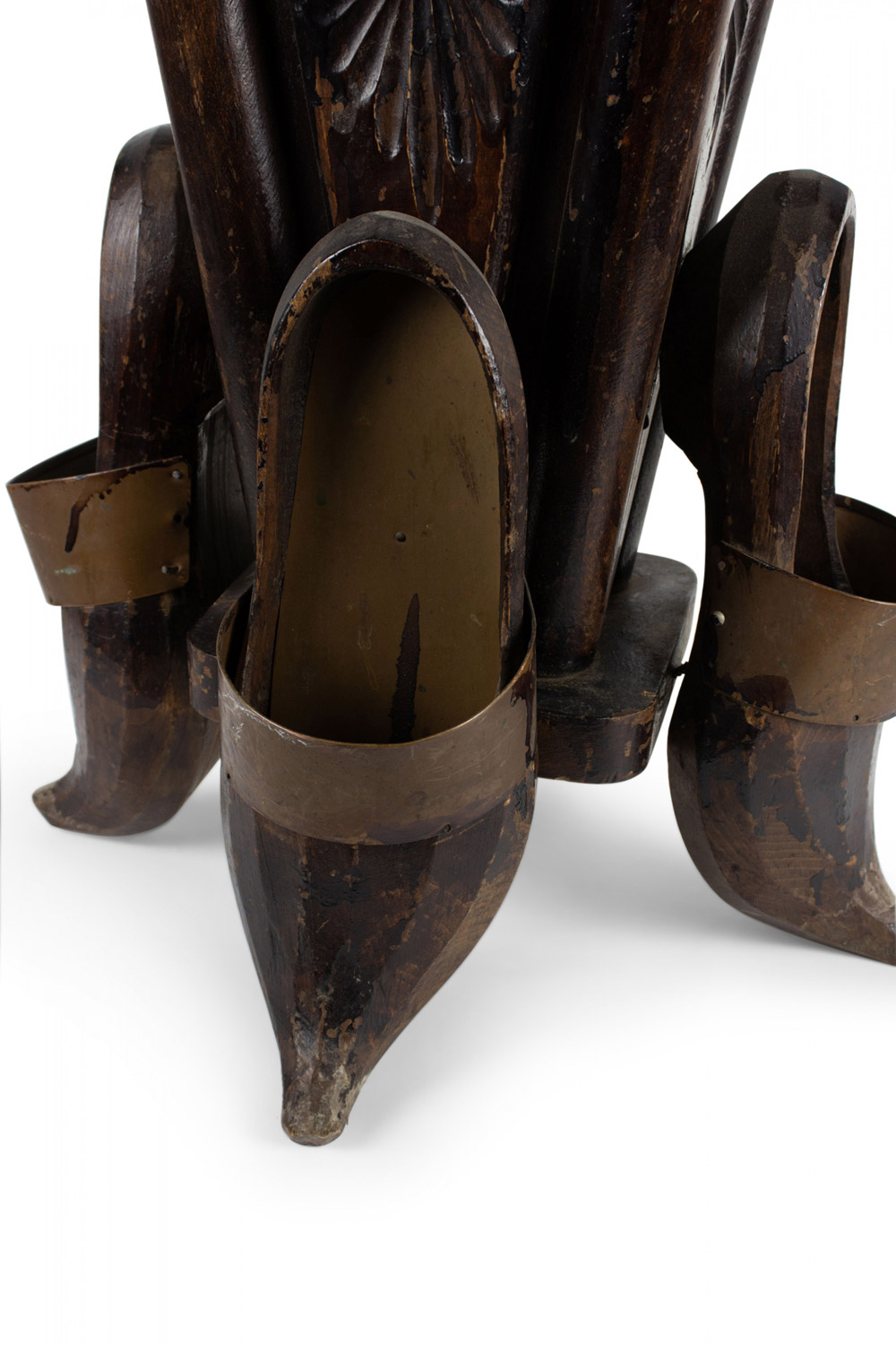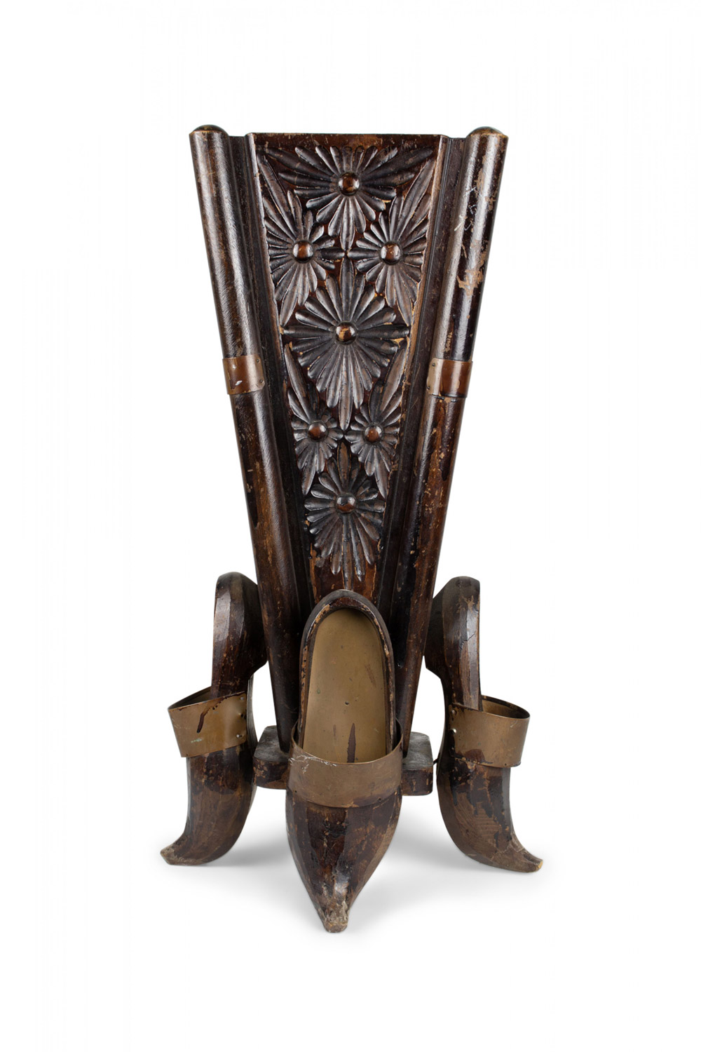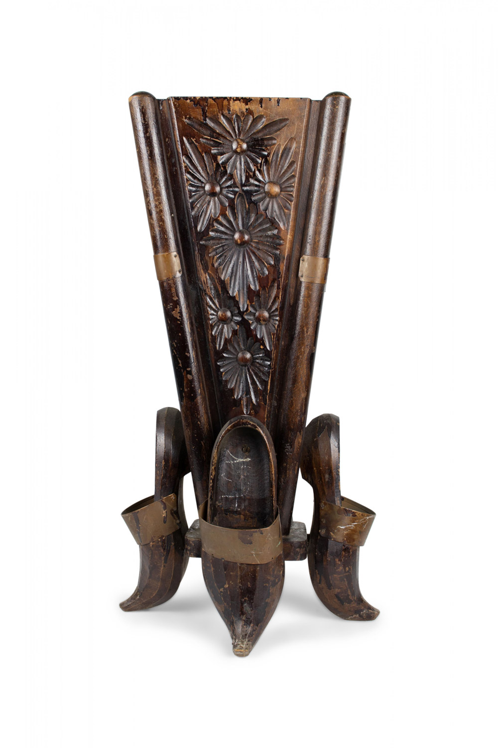 Continental Dutch-style (19/20th Century) carved and stained wood umbrella stand with 4 shoes at base and copper trim