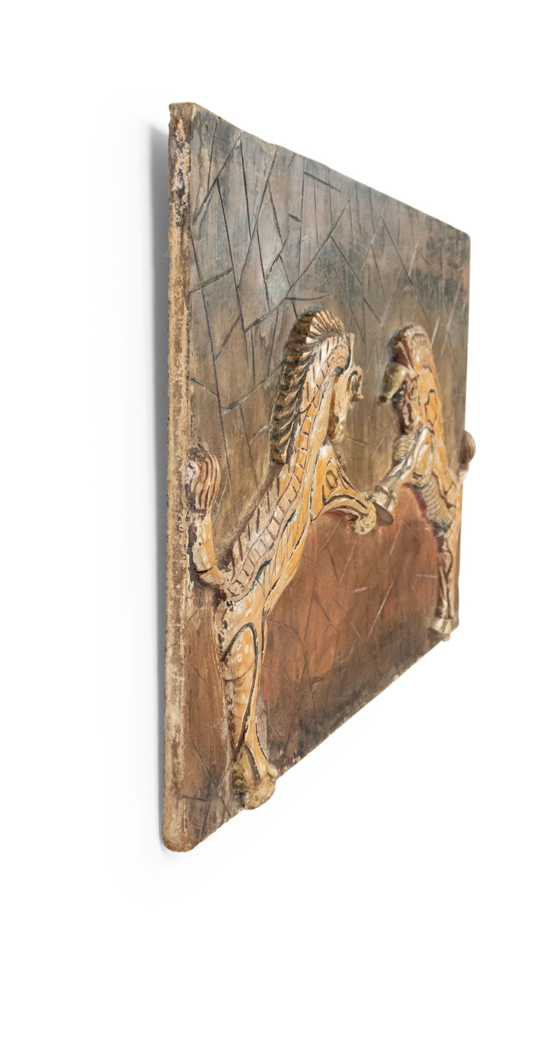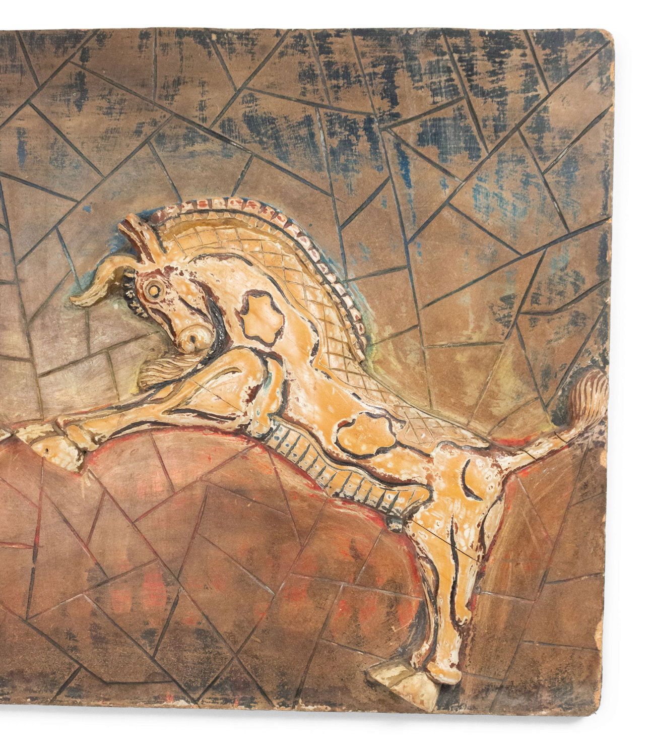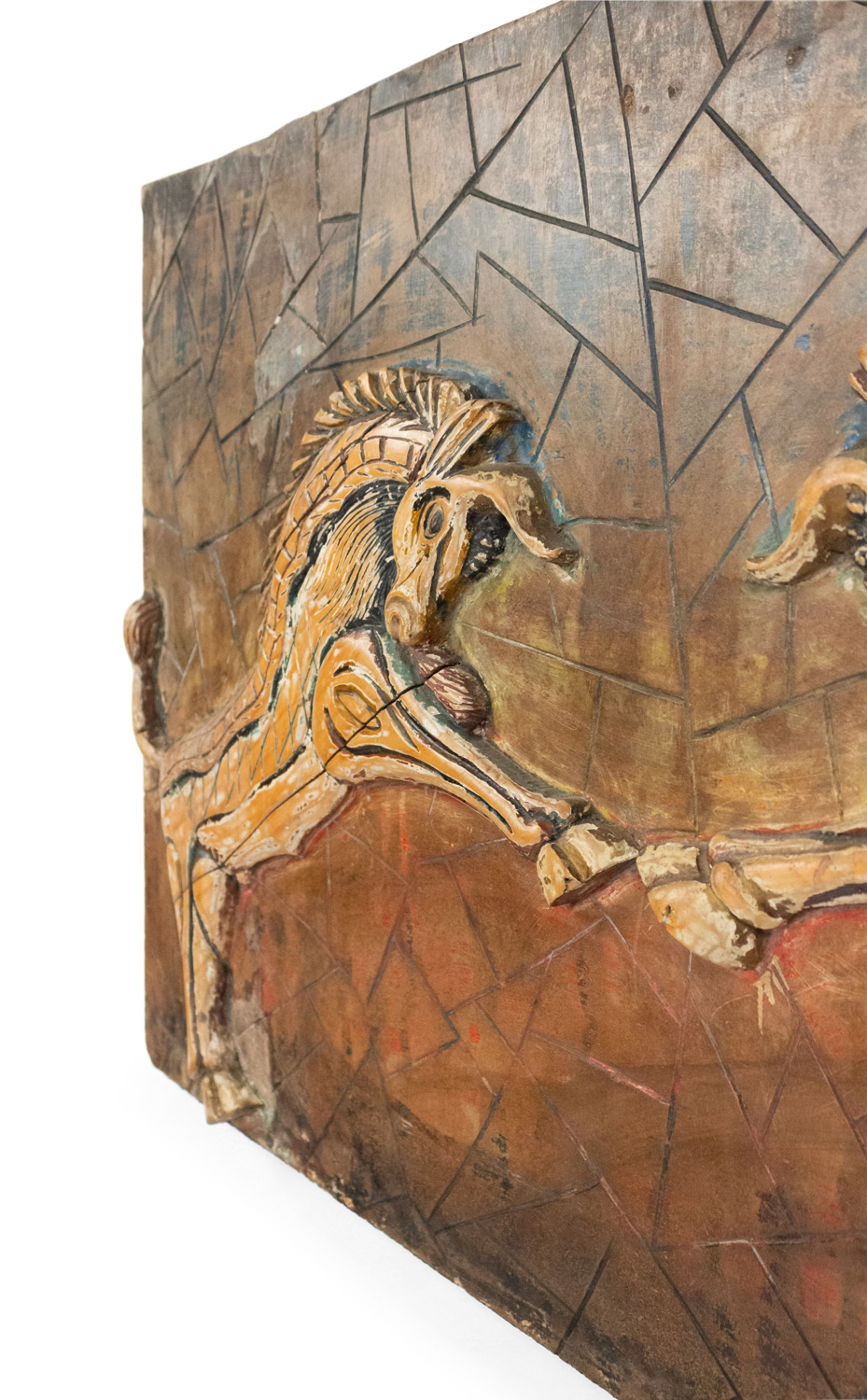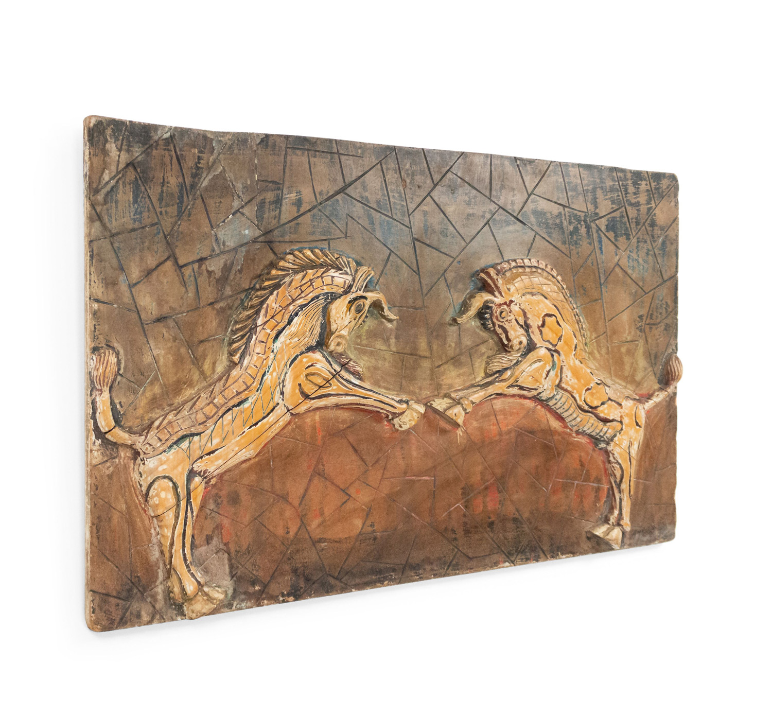 Egyptian style (20th Century) stripped and painted wall plaque with 2 rearing bulls..