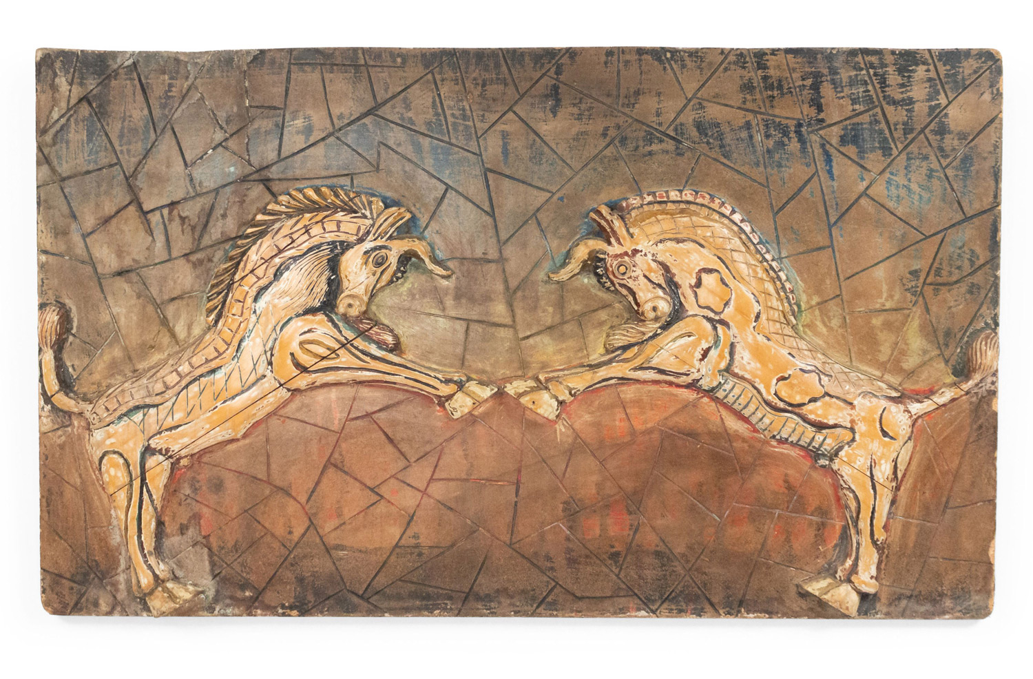 Egyptian style (20th Century) stripped and painted wall plaque with 2 rearing bulls.