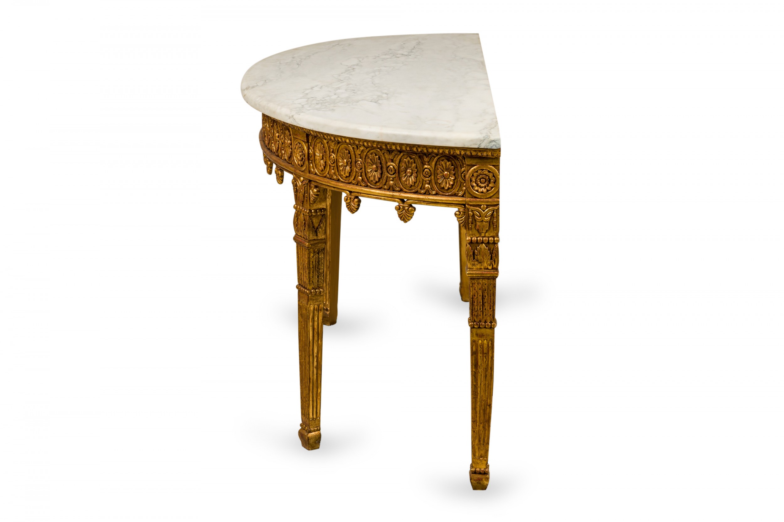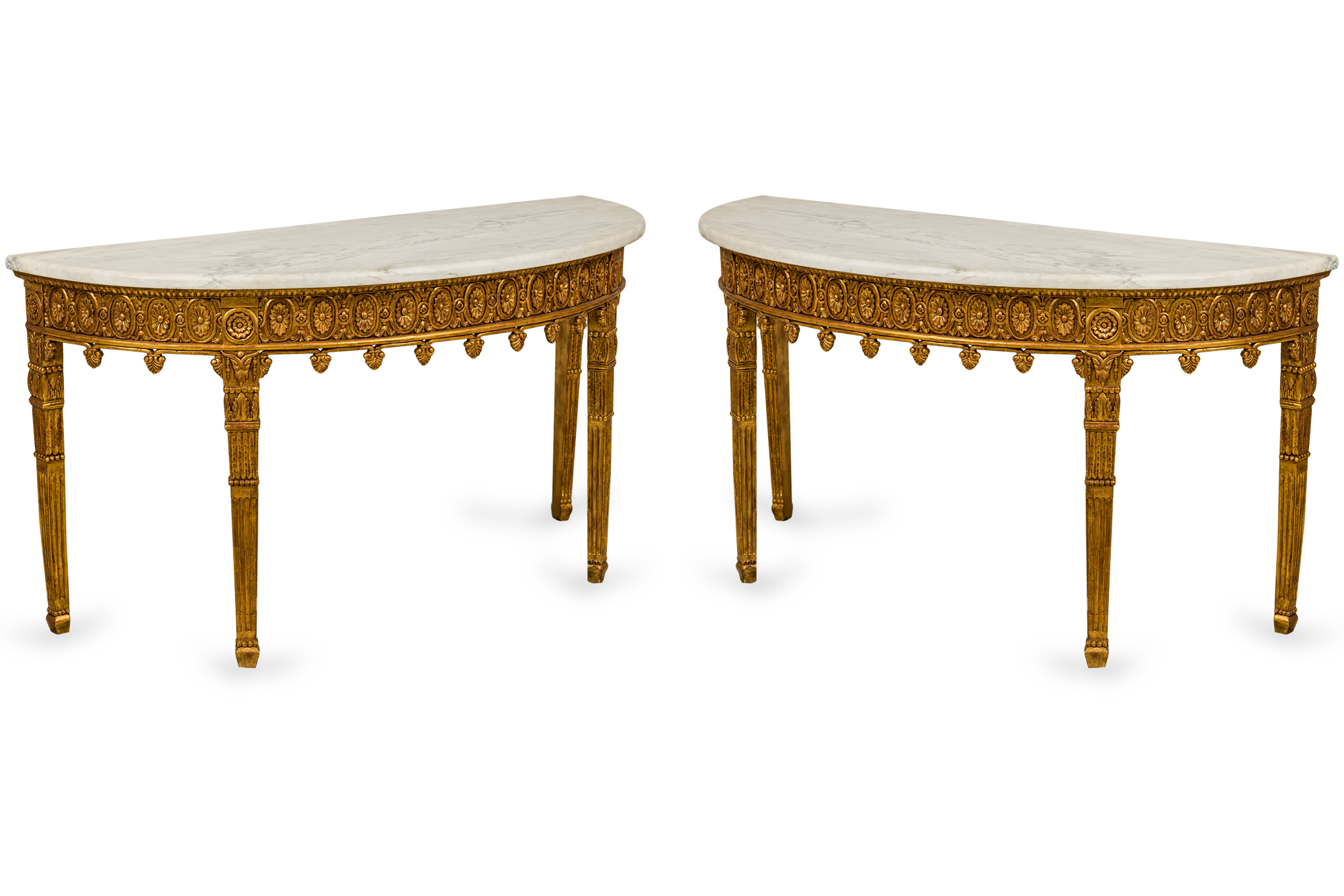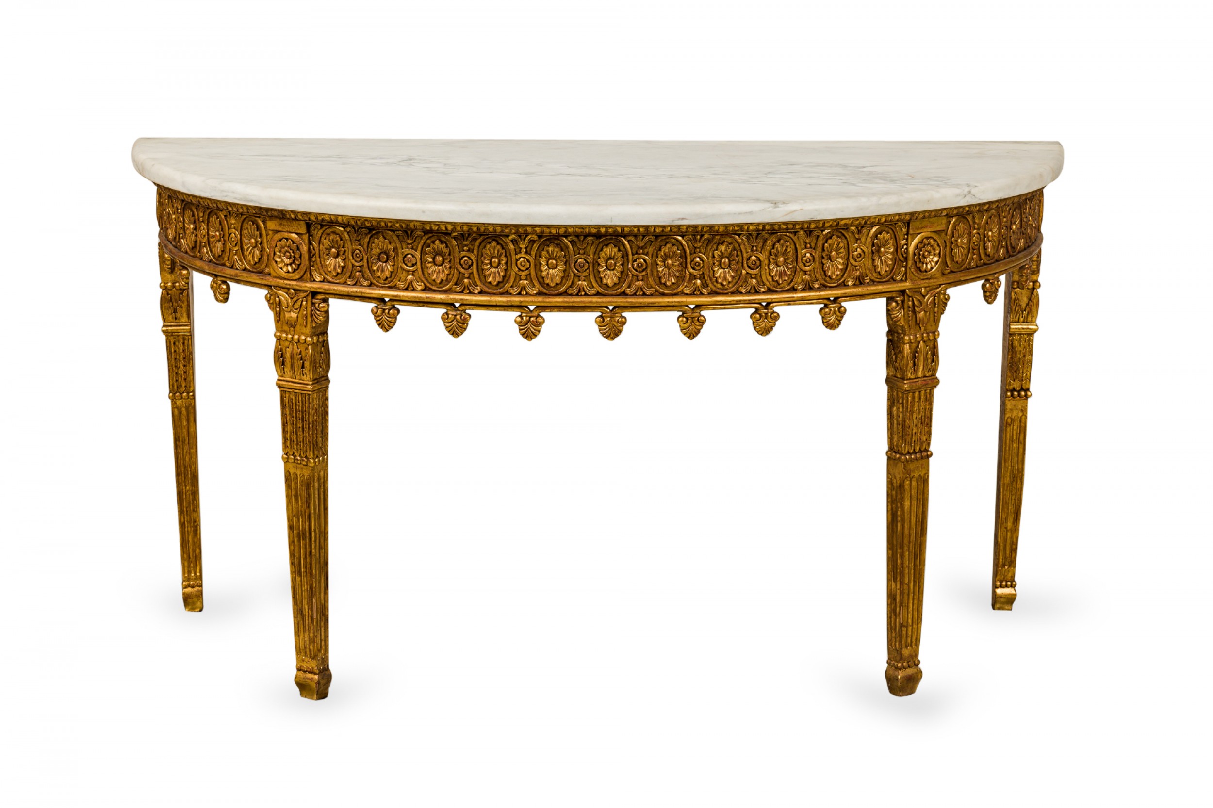 PAIR of English Adam-style (20th Century) gilt carved demilune shaped console tables with finials on apron and fluted rectangular legs. (PRICED AS PAIR)