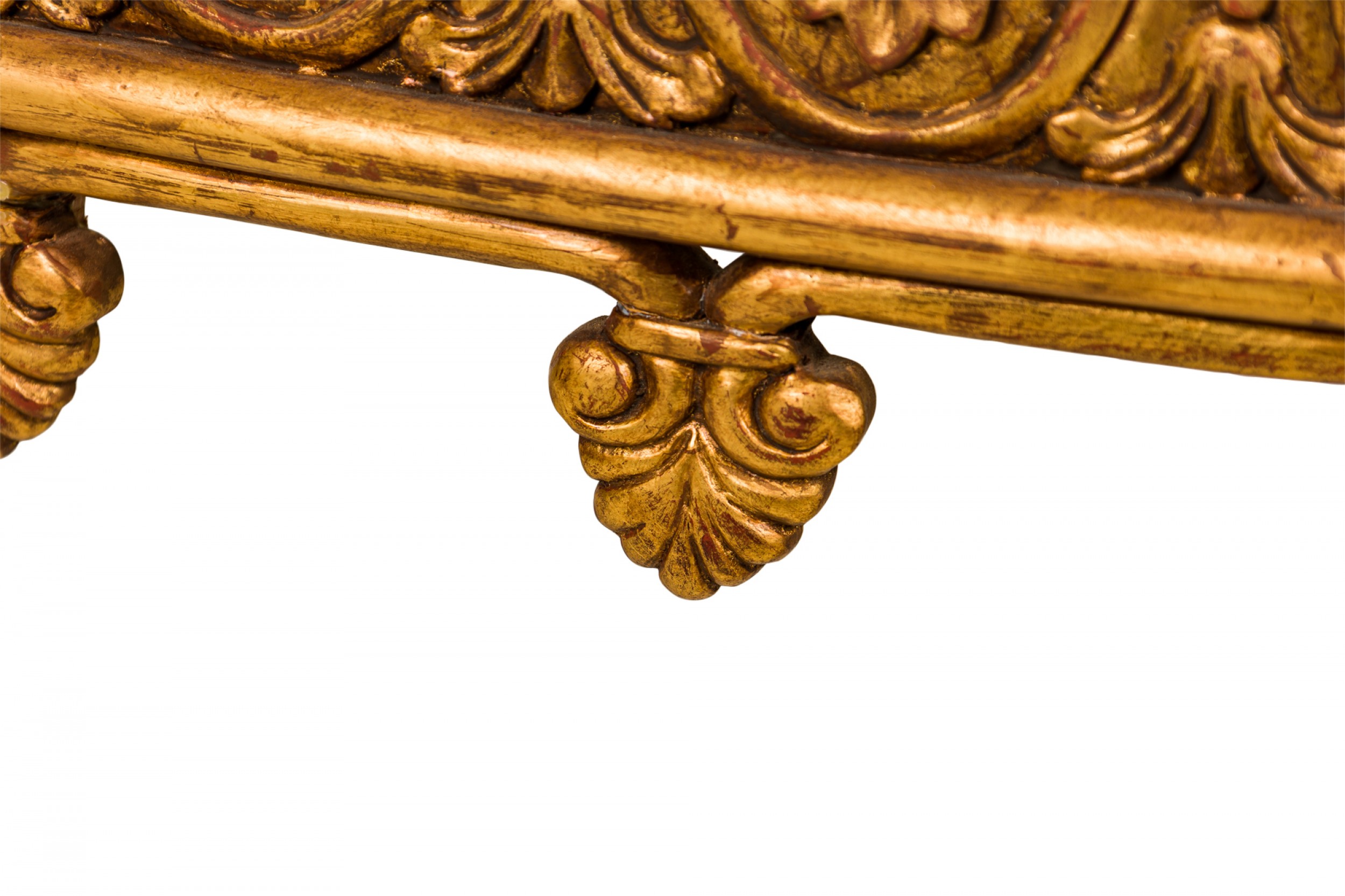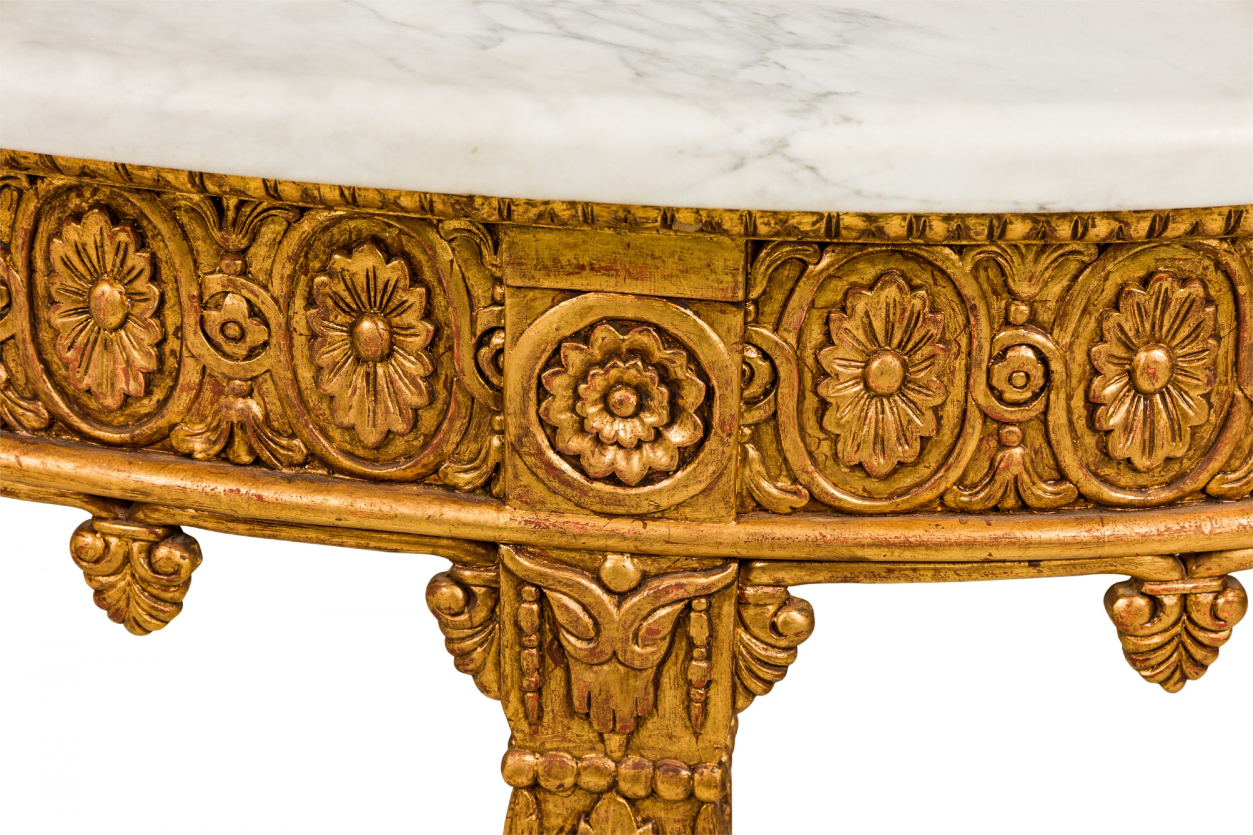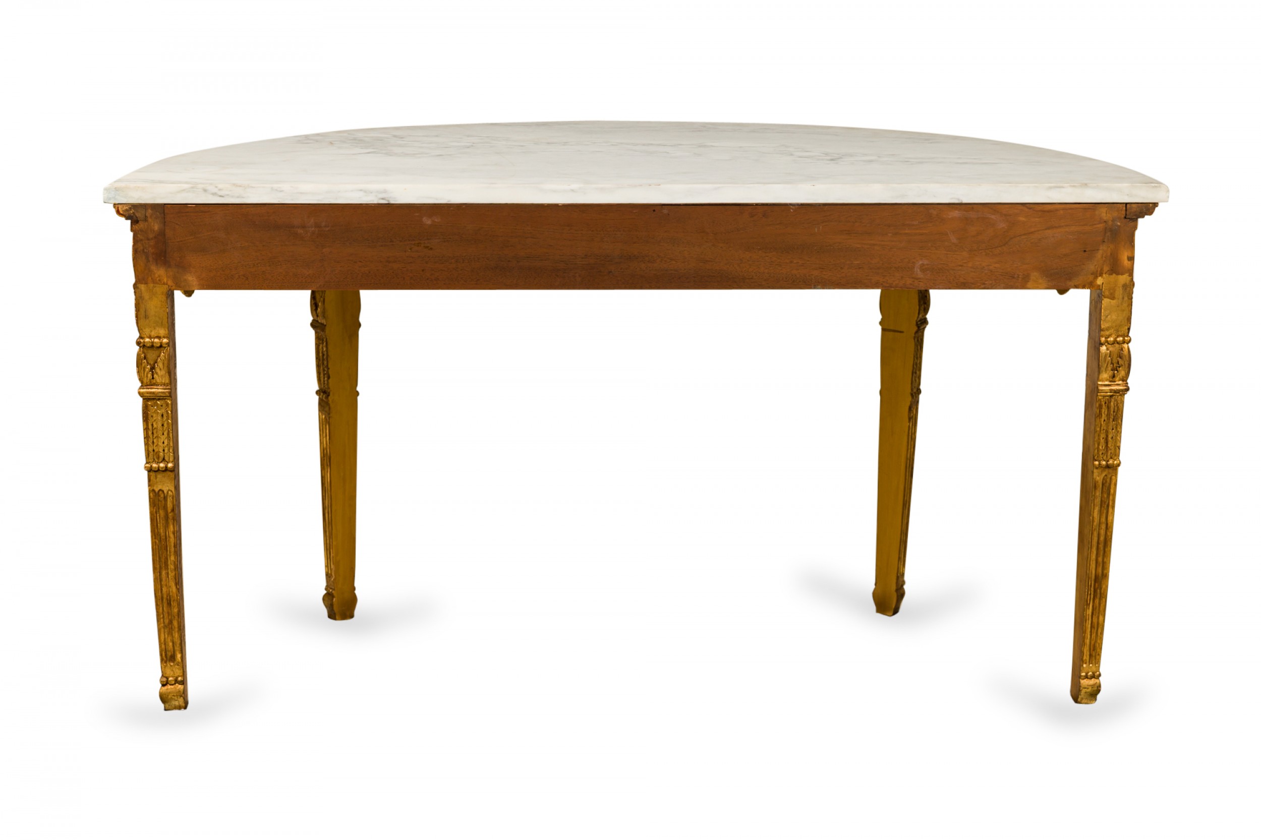 PAIR of English Adam-style (20th Century) gilt carved demilune shaped console tables with finials on apron and fluted rectangular legs. (PRICED AS PAIR)