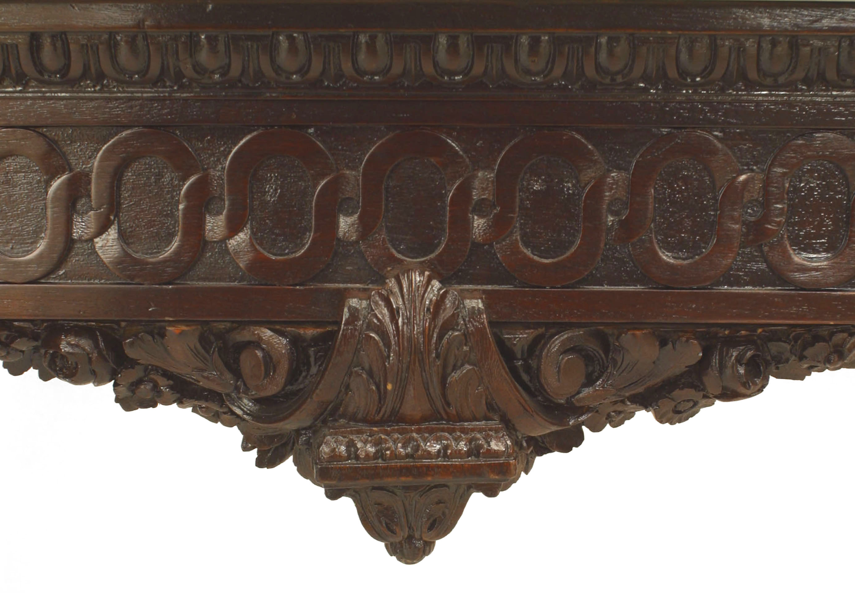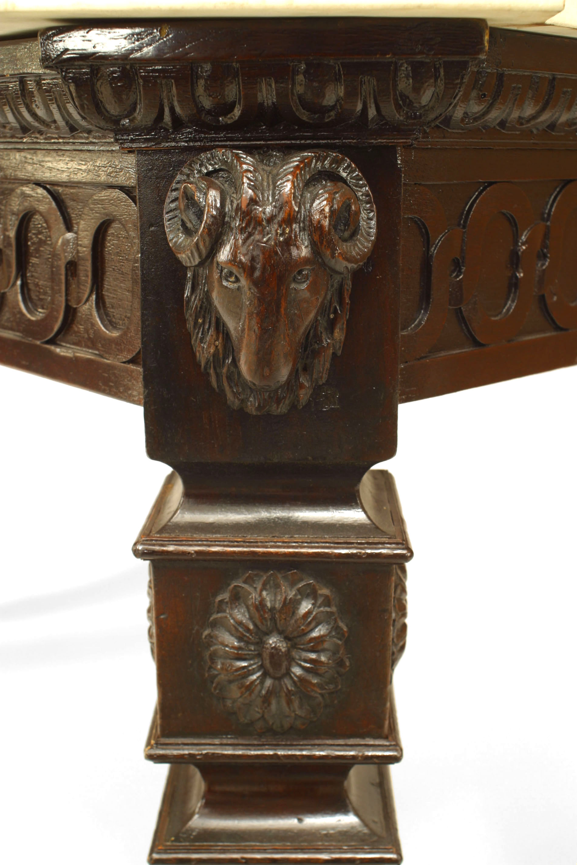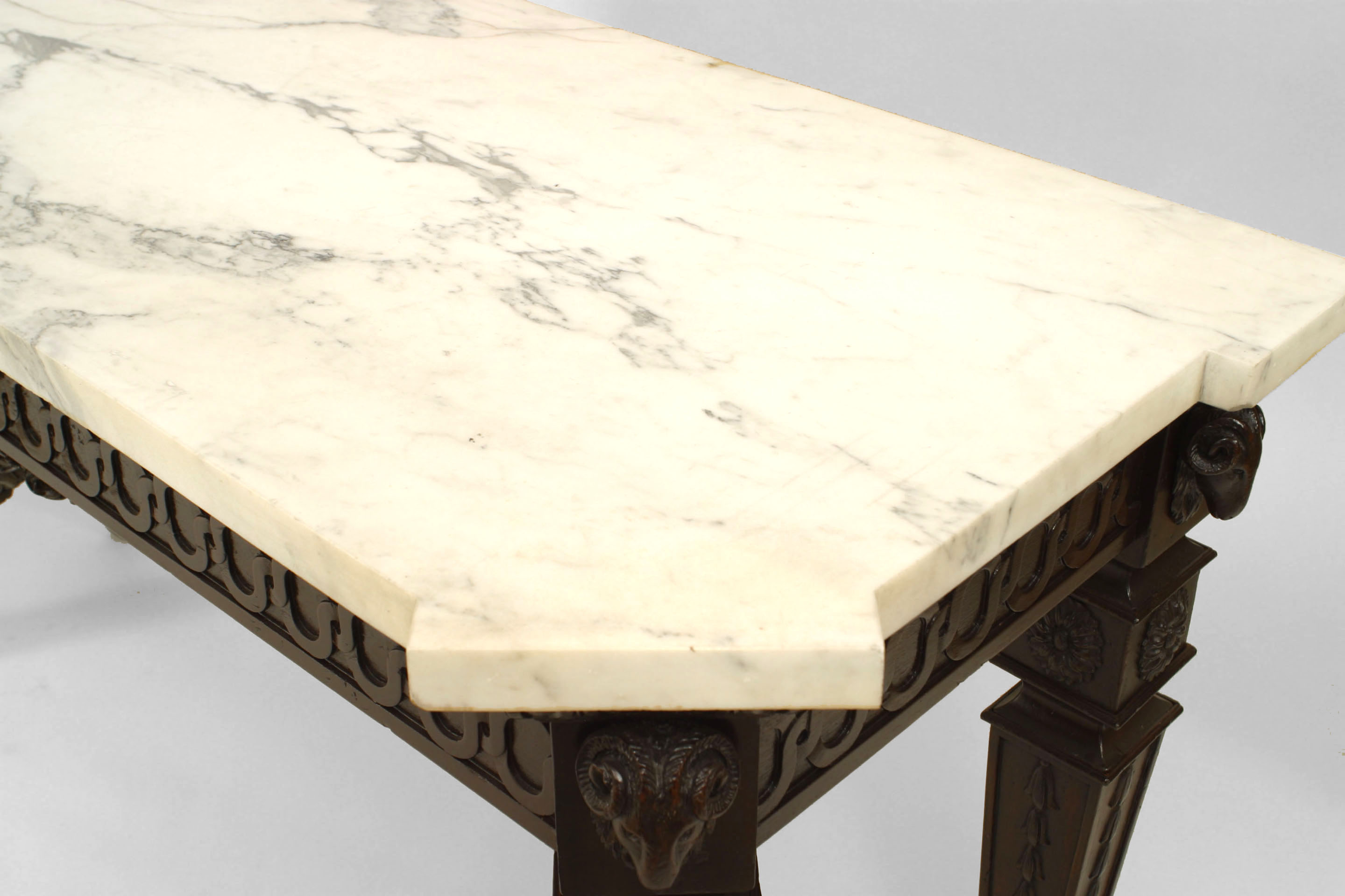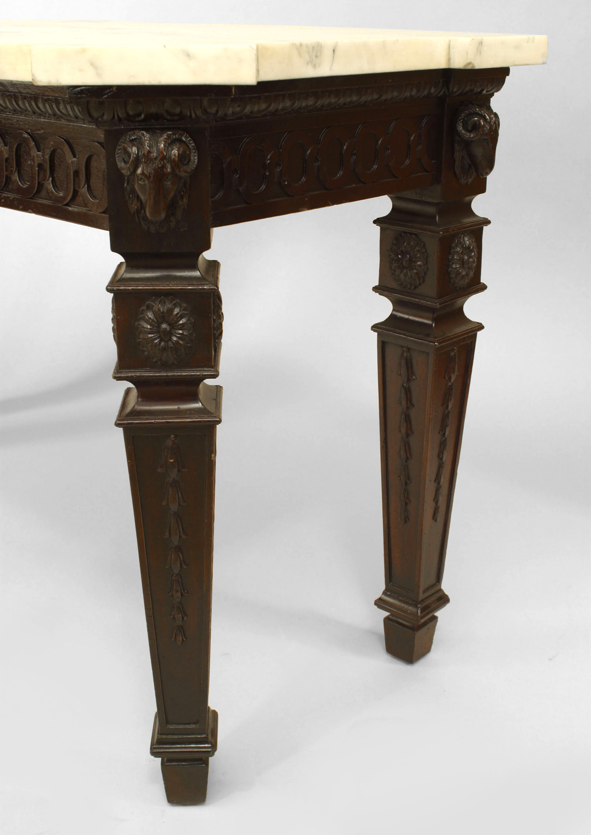 English Adam-style (19th Century) mahogany carved console table with square tapered legs with ram heads and marble top.