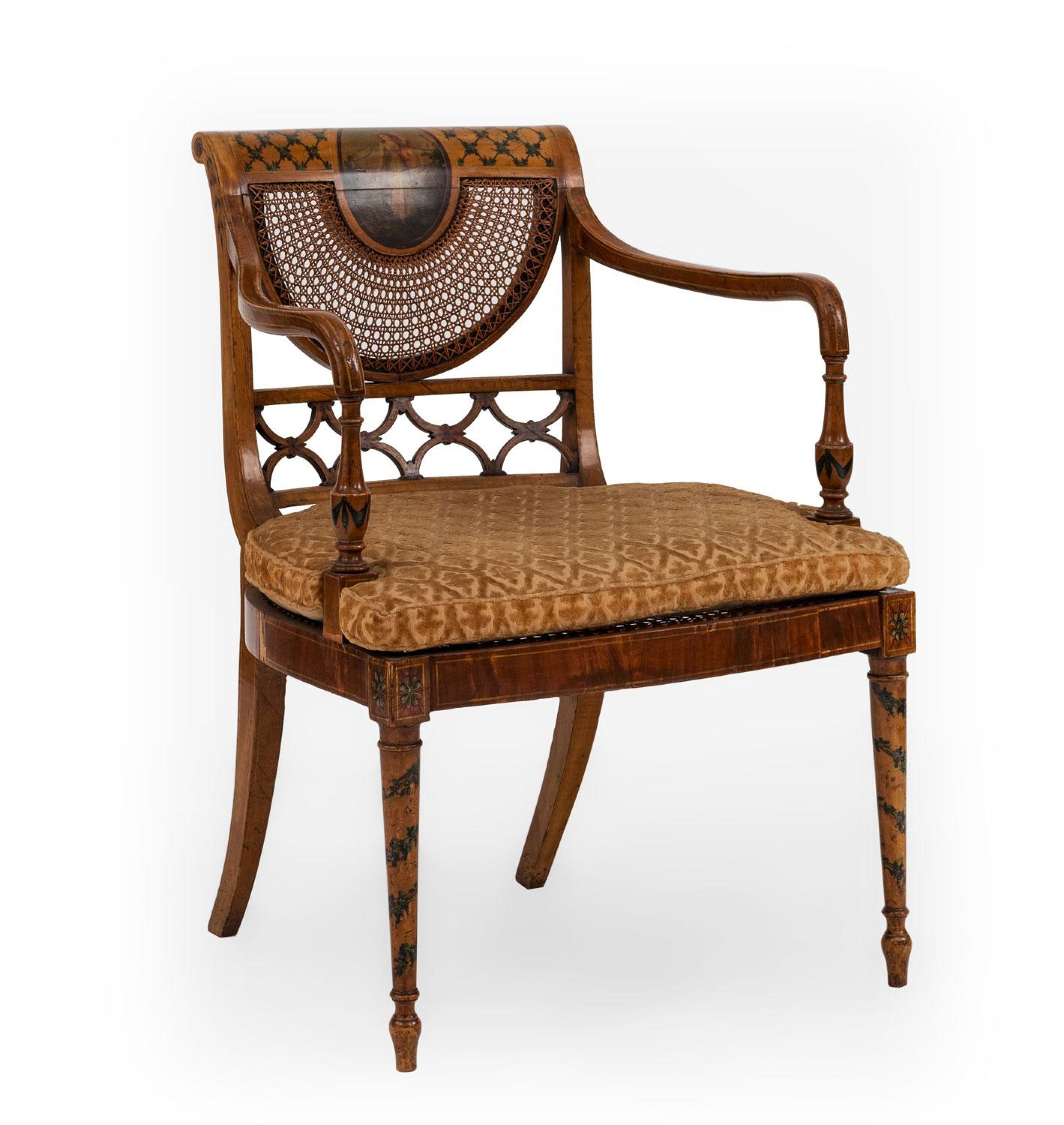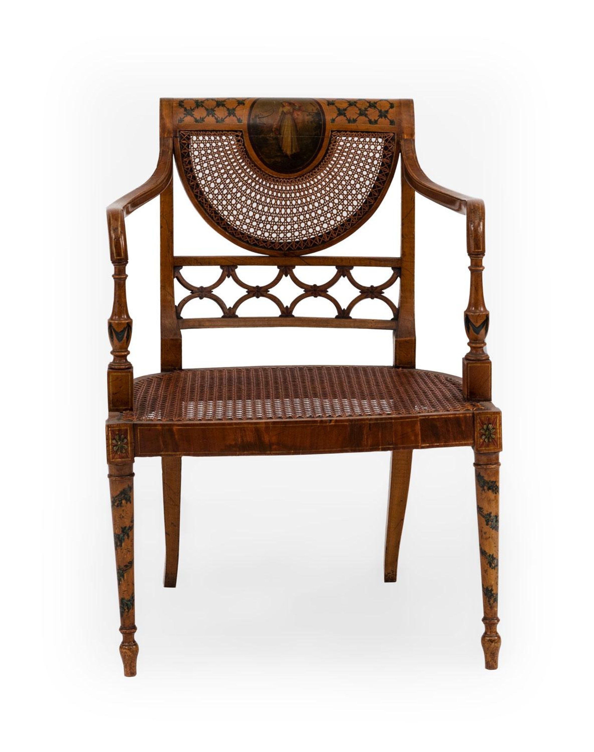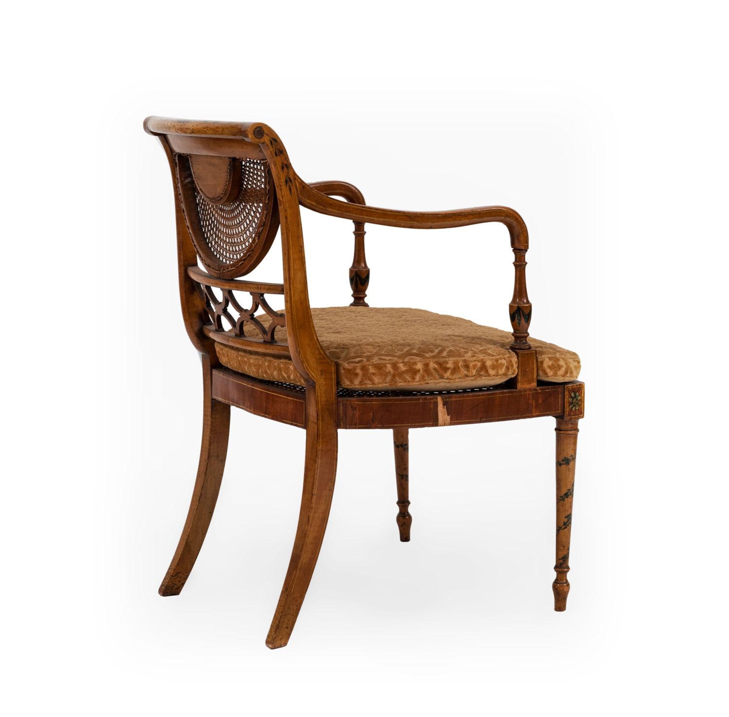 4 English Adam style (18/19th Cent) satinwood and cane back armchairs with painted panels (SEE ALSO: matching loveseat: 037850A, matching side chairs: 037850C)(PRICED ALL 4).