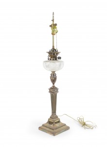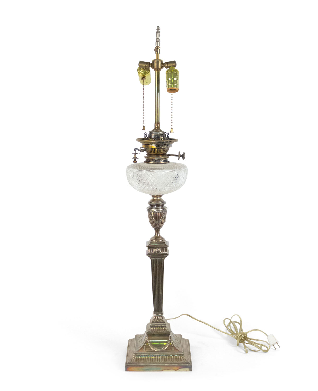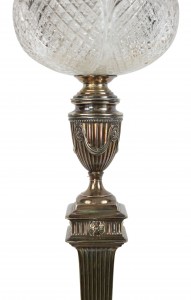 English Adam style (19th Cent) silver plate column table lamp with urn design and cut crystal font