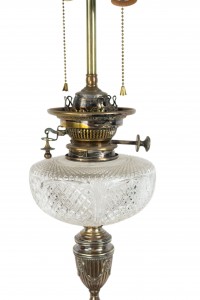 English Adam style (19th Cent) silver plate column table lamp with urn design and cut crystal font.