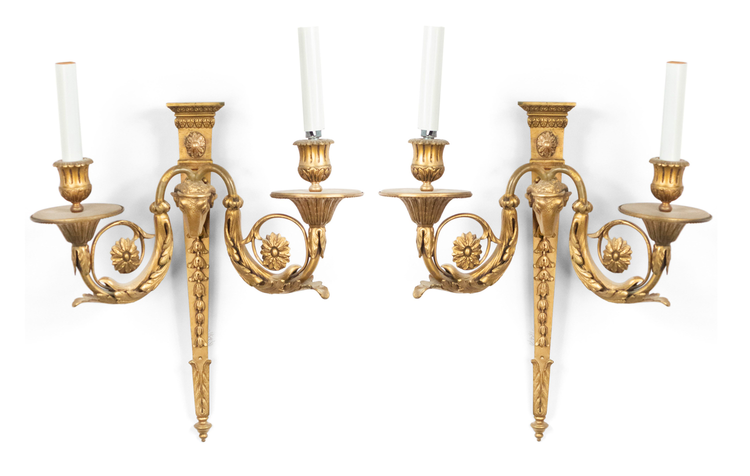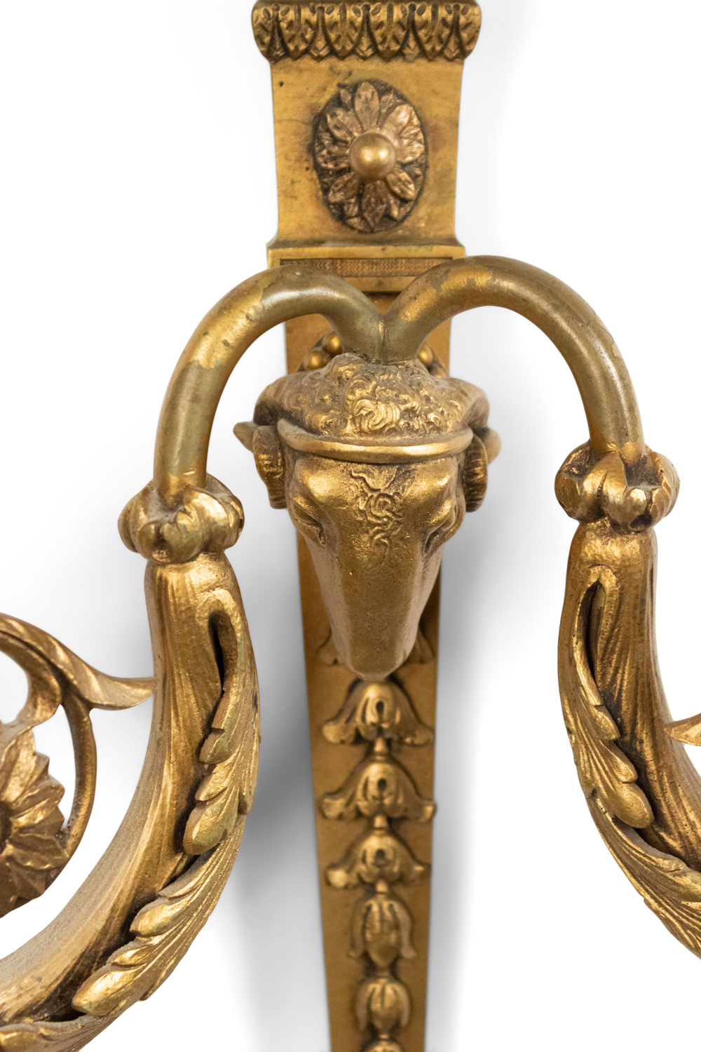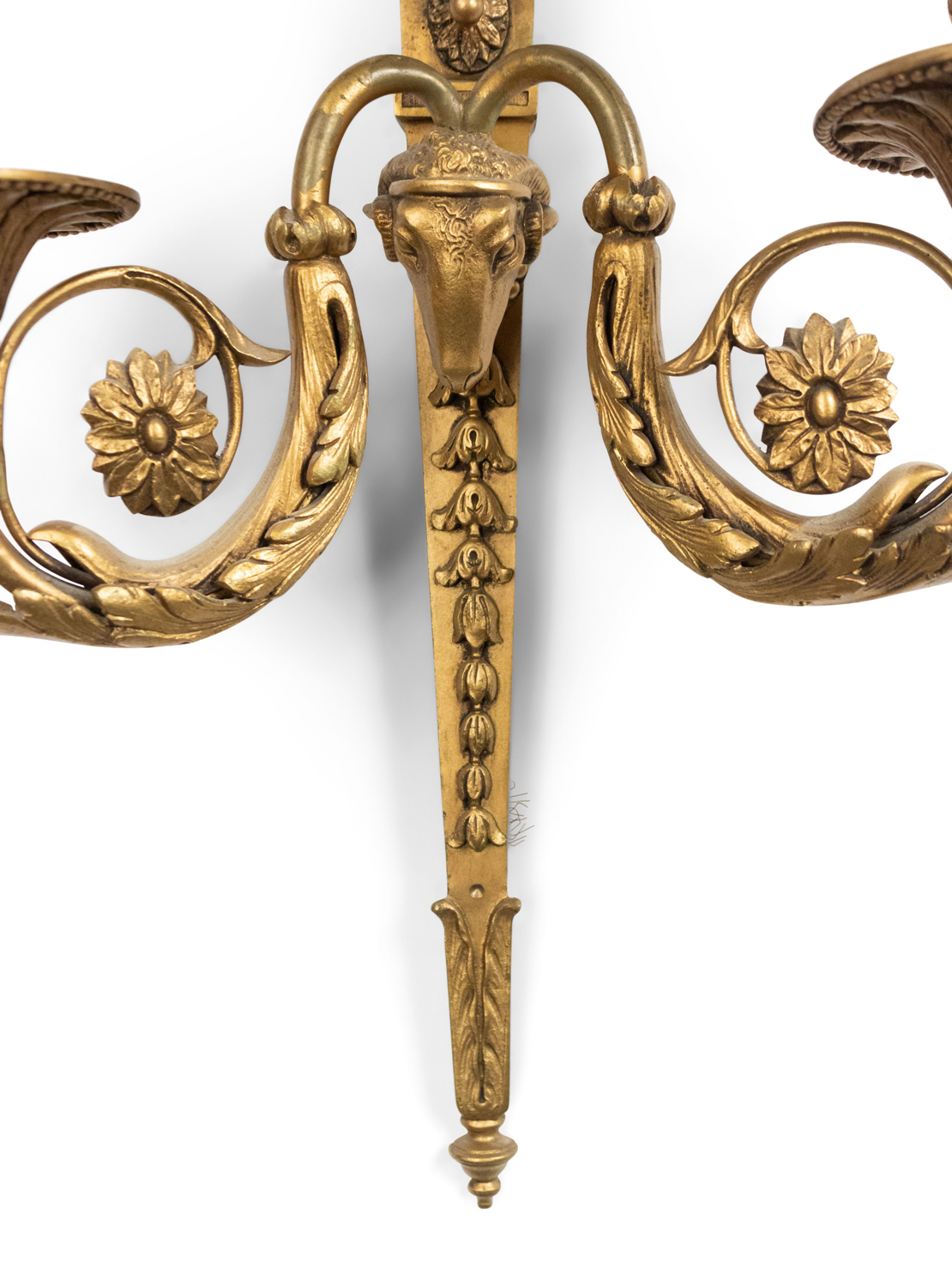 PAIR of English Adam-style (19/20th Century) bronze dore wall sconces with two scroll arms and ram's head design. (PRICED AS PAIR).