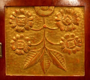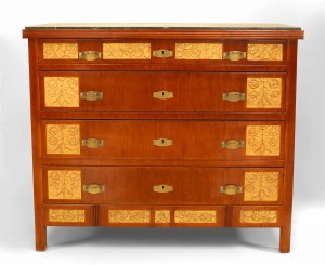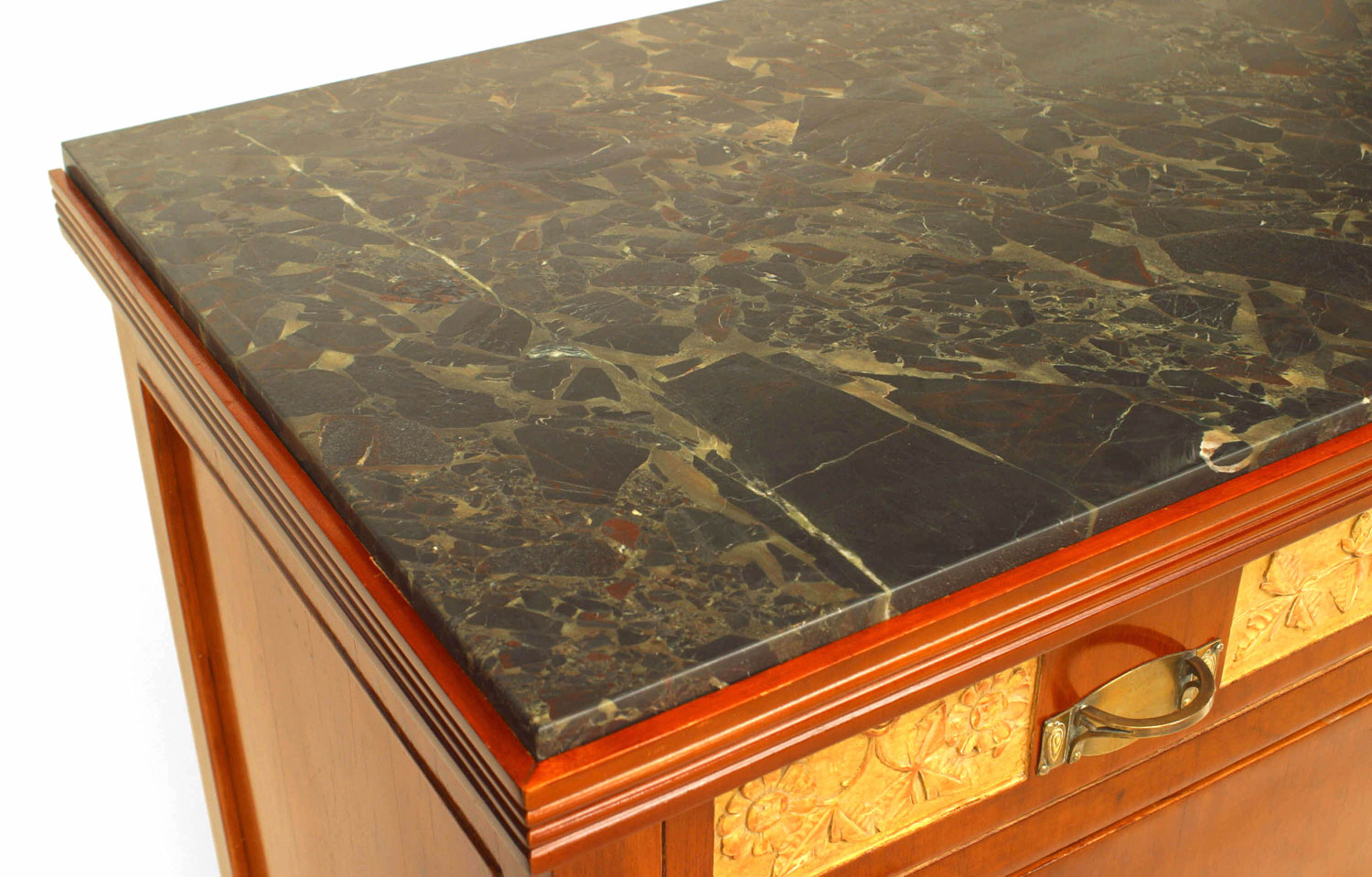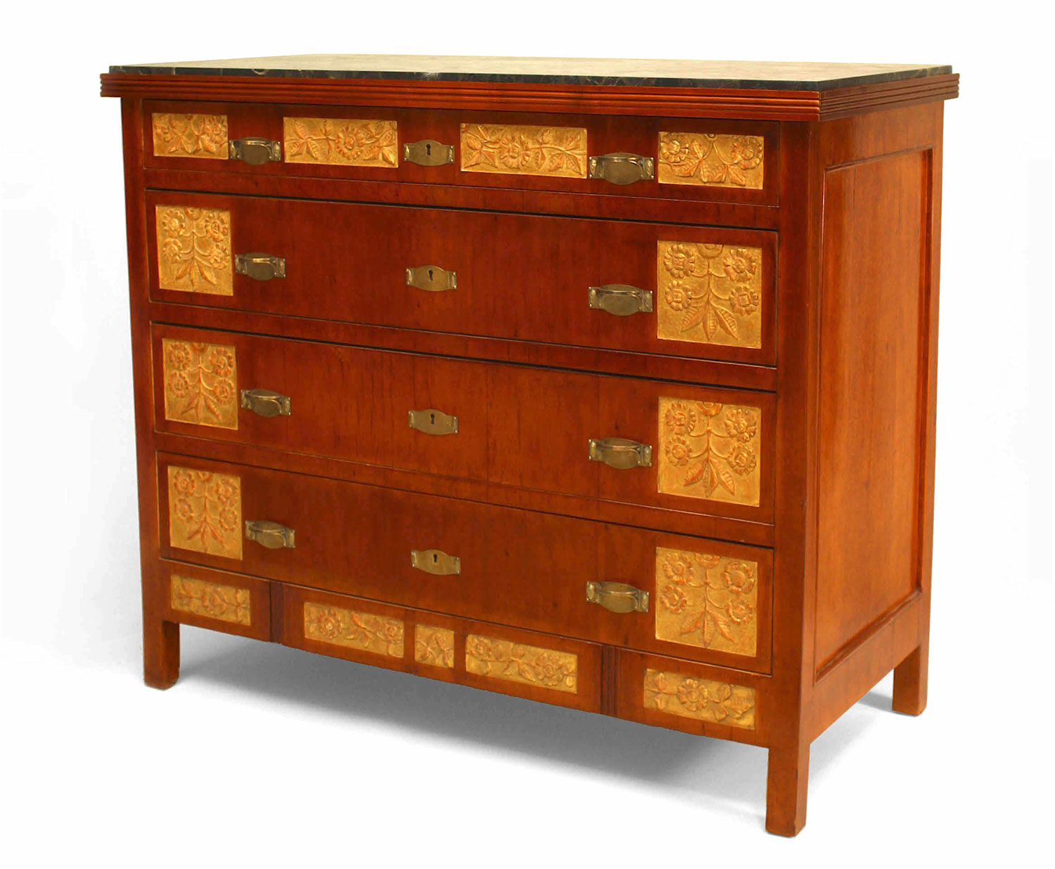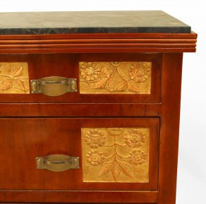English Aesthetic Movement mahogany chest with 4 drawers and gilt foliate carved panels with brass handles and trim and an inset marble top.