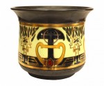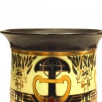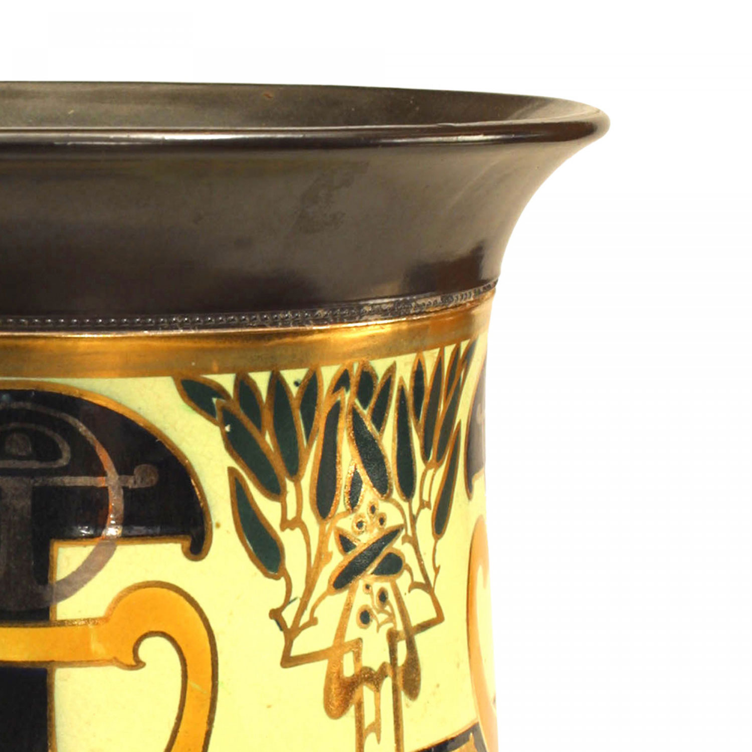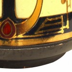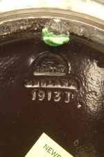 English Arts and Crafts black pottery jardiniere with celadon and gold decoration. (stamps on bottom: BRETBY ENGLAND 1913J)