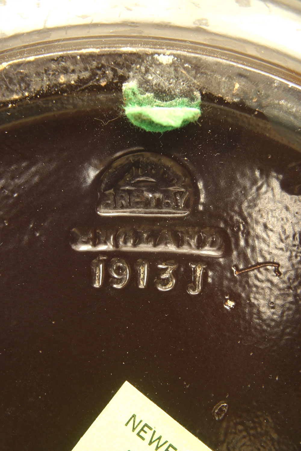 English Arts and Crafts black pottery jardiniere with celadon and gold decoration. (stamps on bottom: BRETBY ENGLAND 1913J).