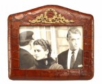English Victorian (20th Century) brown crocodile easel picture frame with shaped top with bronze wreath motif.