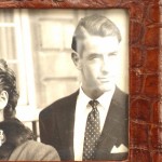 English Victorian (20th Century) brown crocodile easel picture frame with shaped top with bronze wreath motif..