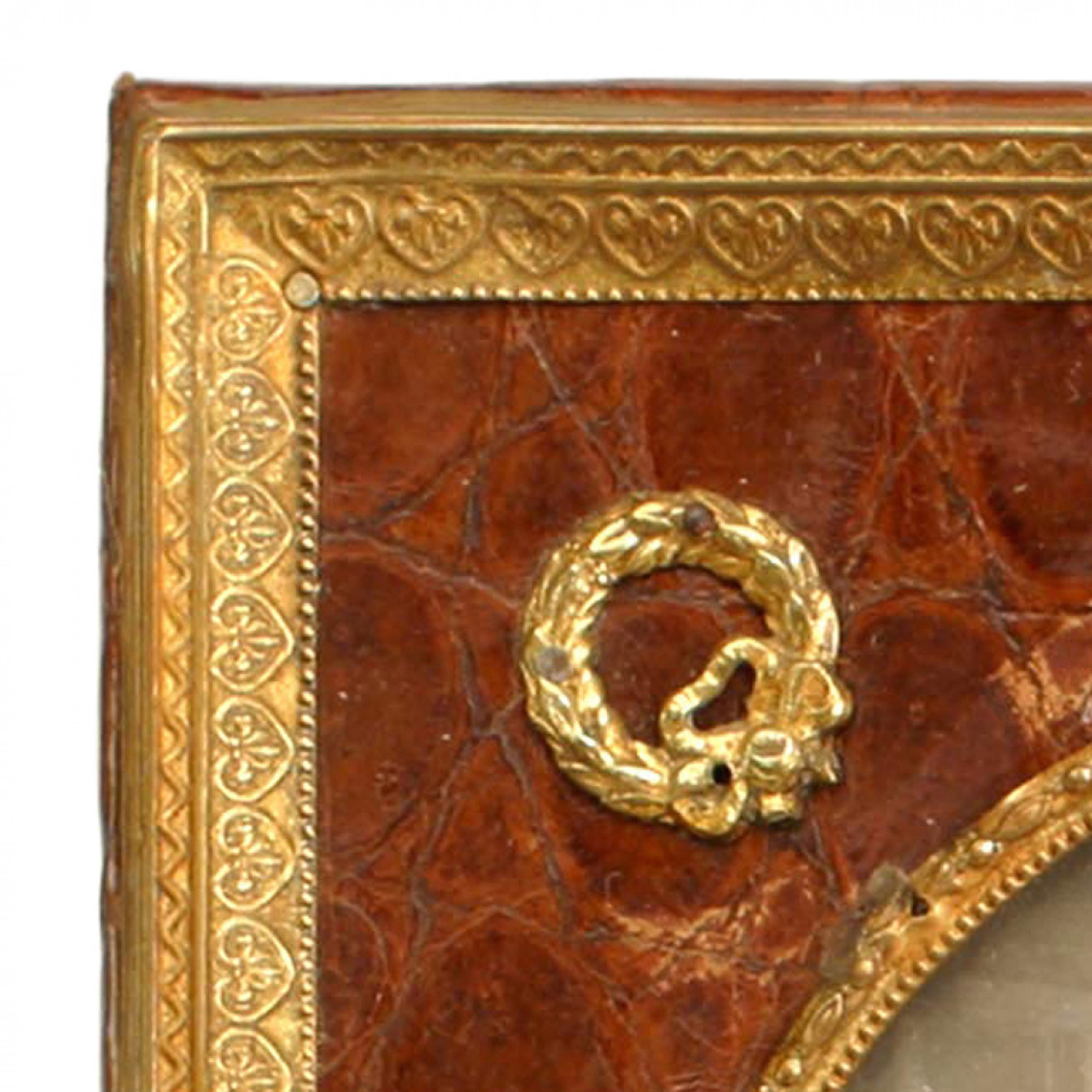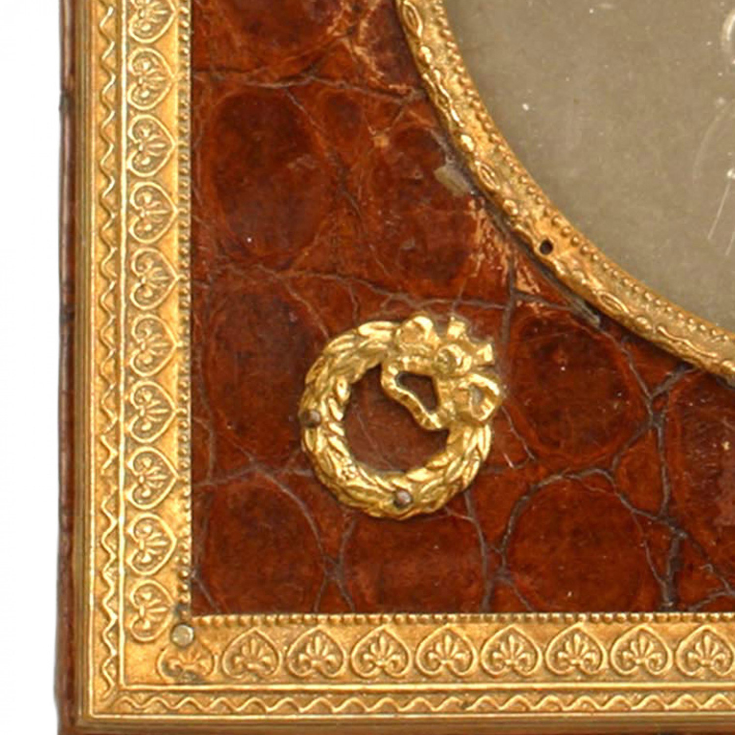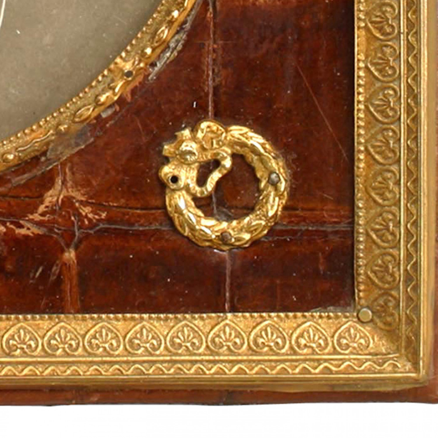 English (20th Century) brown crocodile square shaped easel picture frame with brass border and four wreaths in corners.
