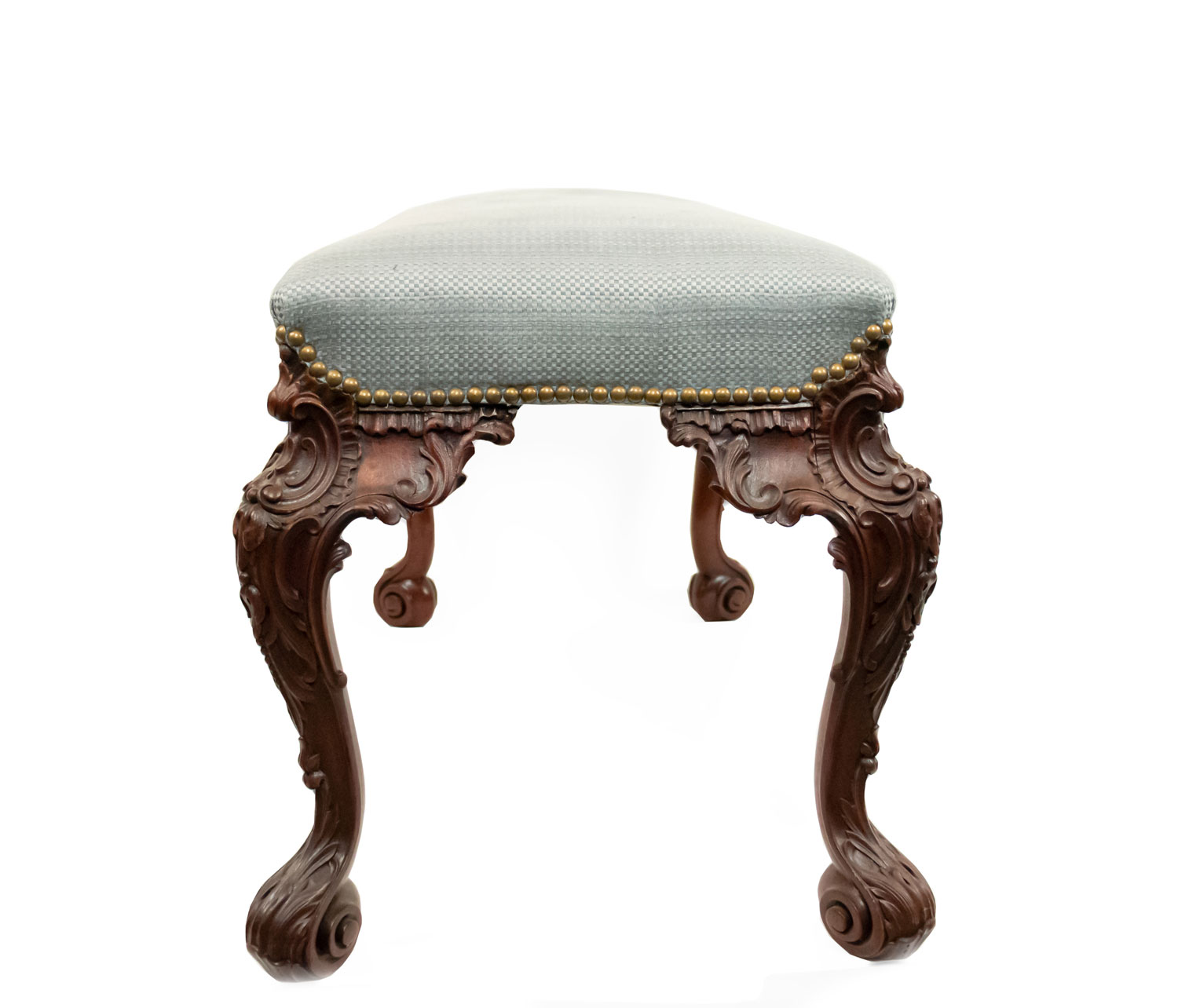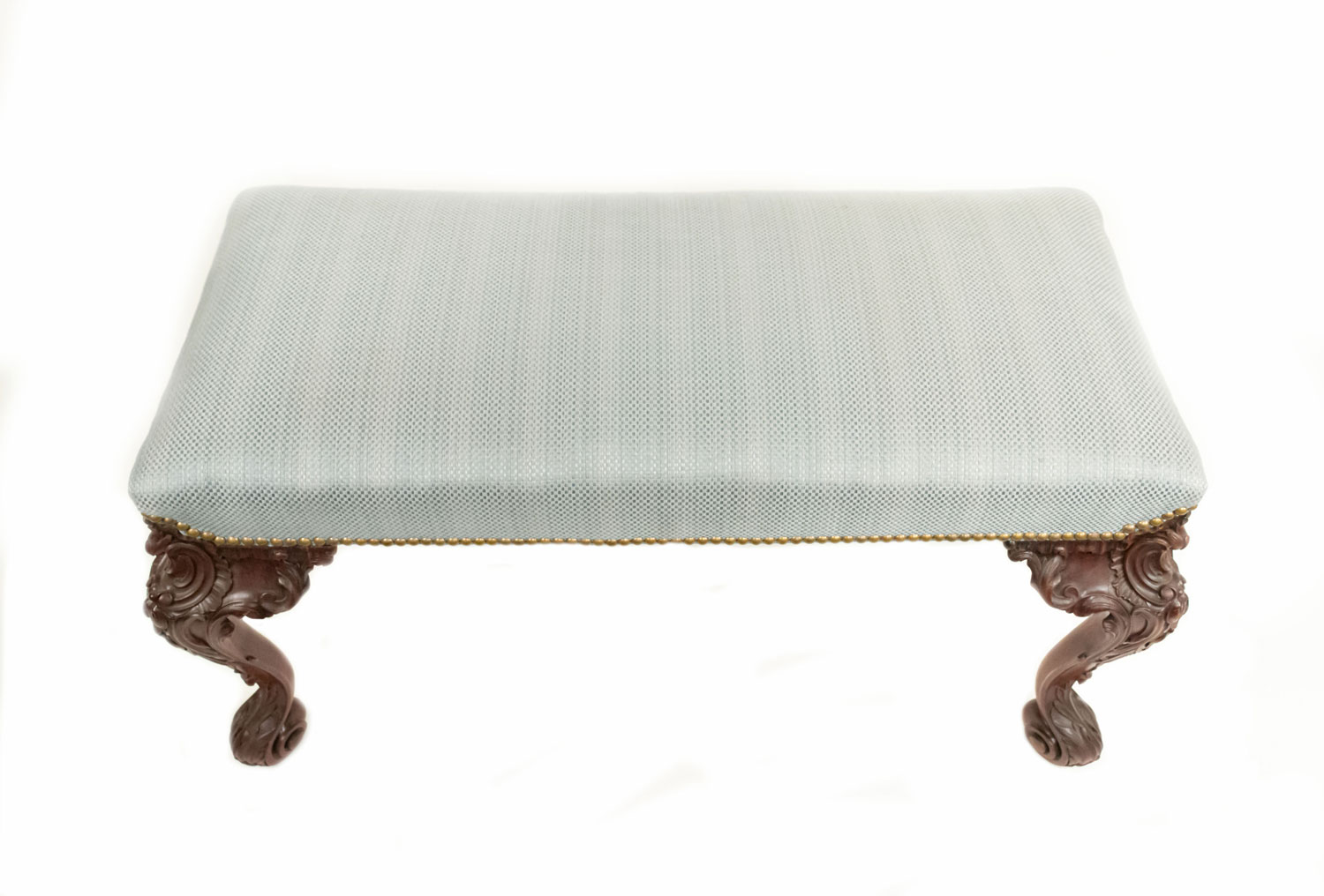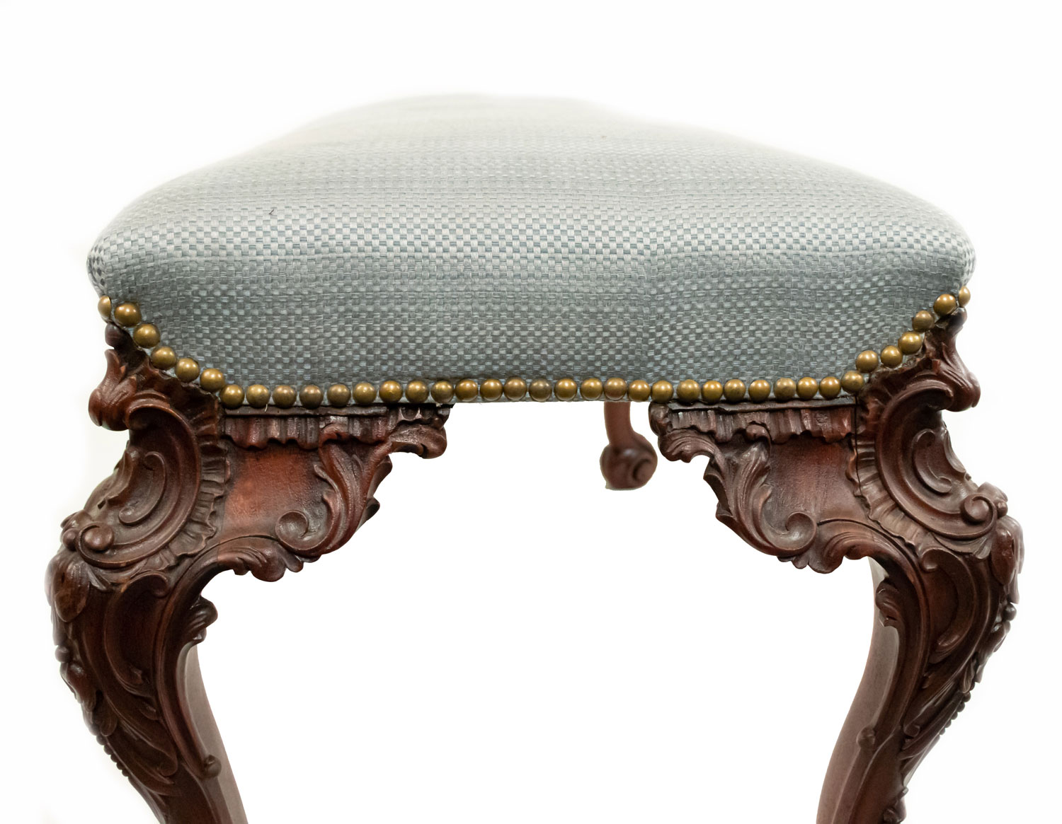 English Chippendale style (19th Century) rectangular carved mahogany bench with blue upholstery..