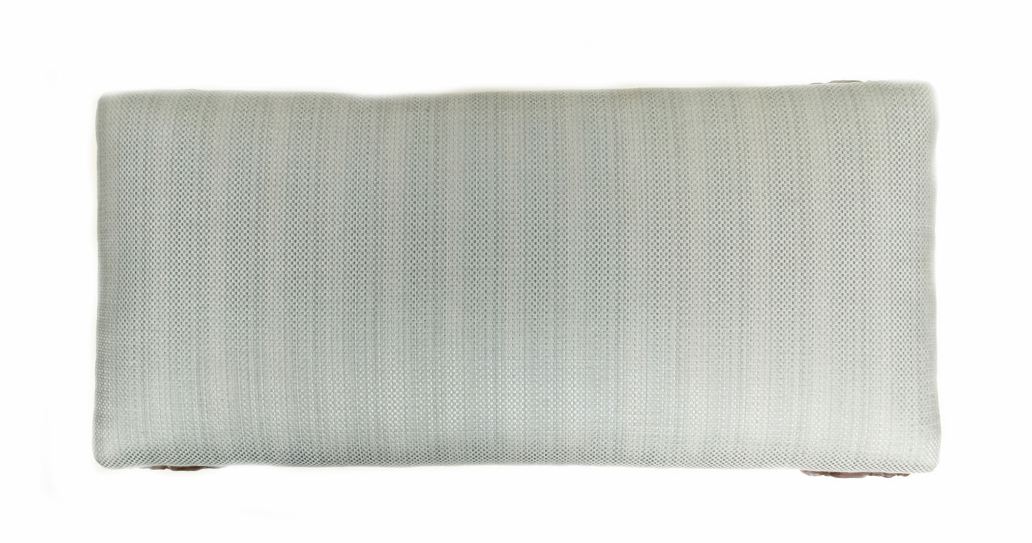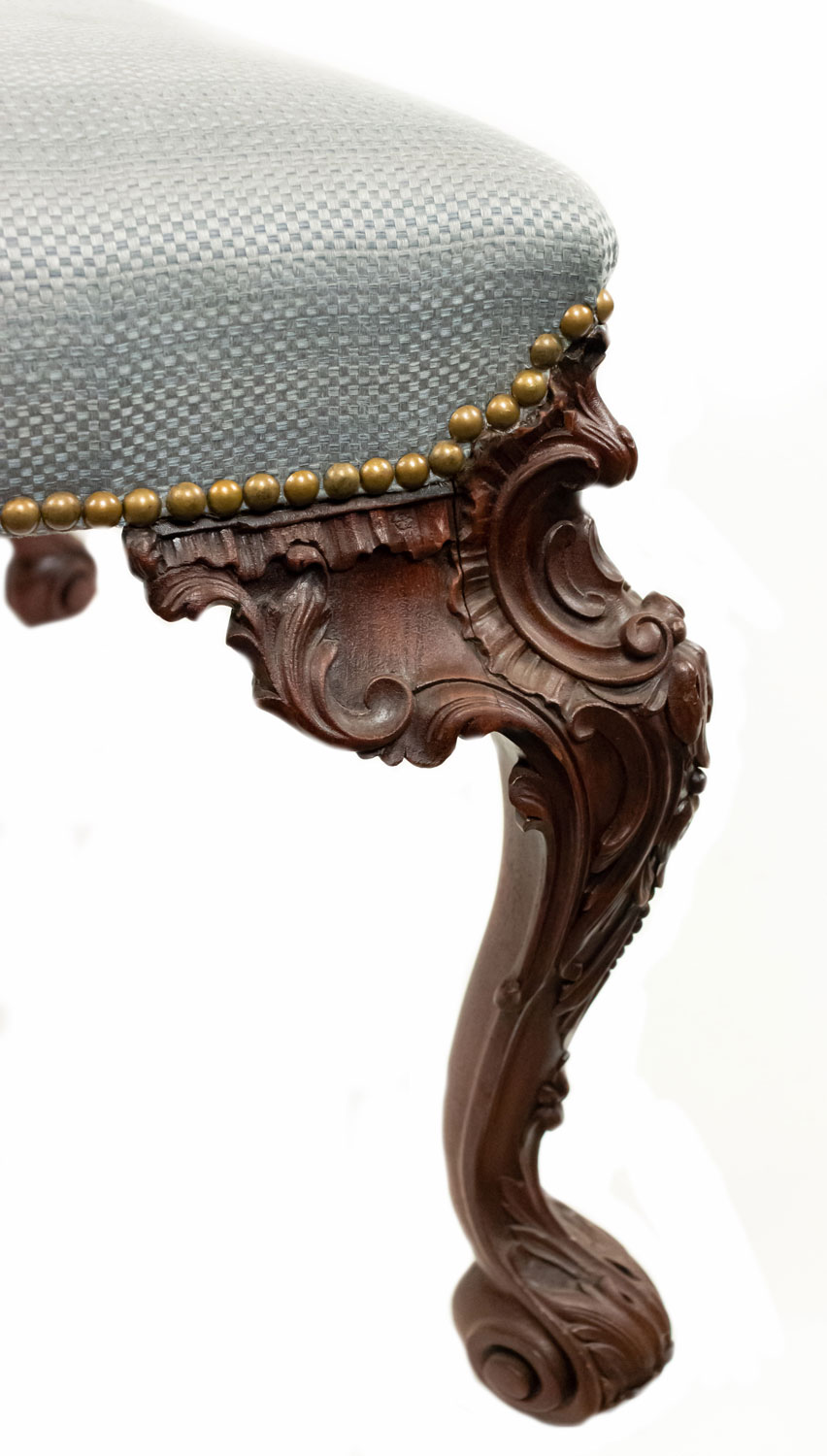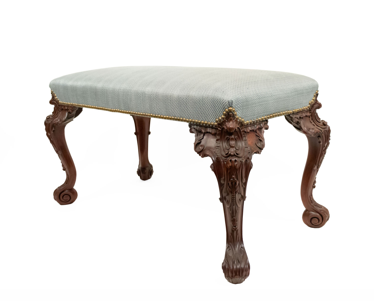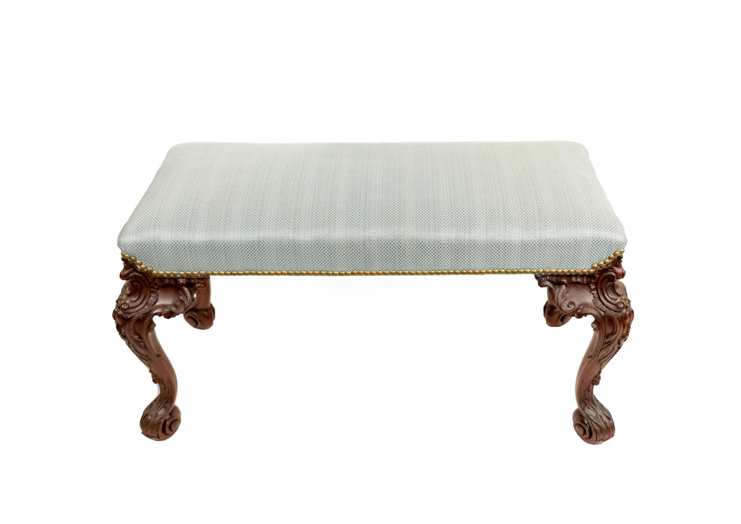 English Chippendale style (19th Century) rectangular carved mahogany bench with blue upholstery..