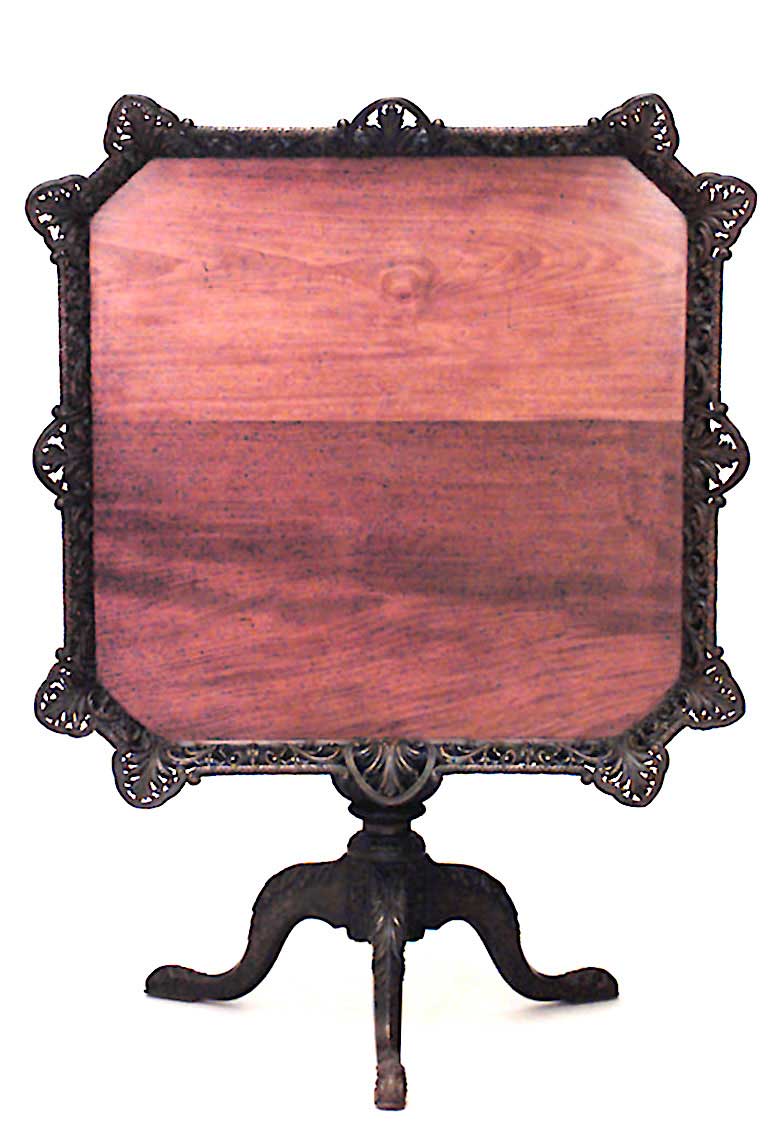 English Chippendale-style (18/19th Century) mahogany pedestal base tilt top tea table with square filigree gallery top.