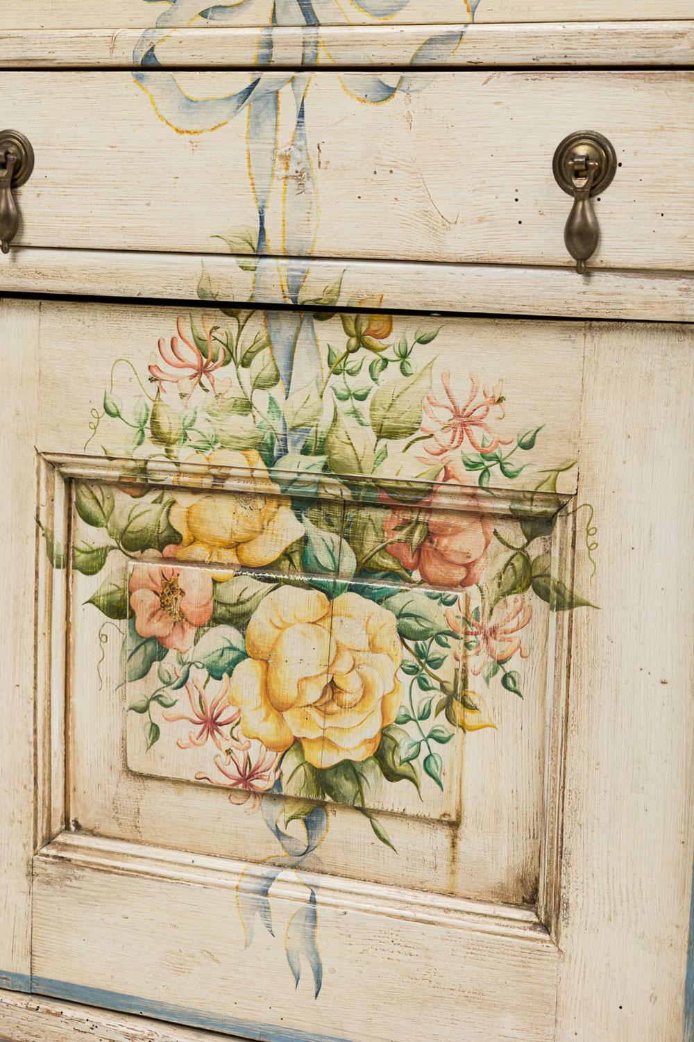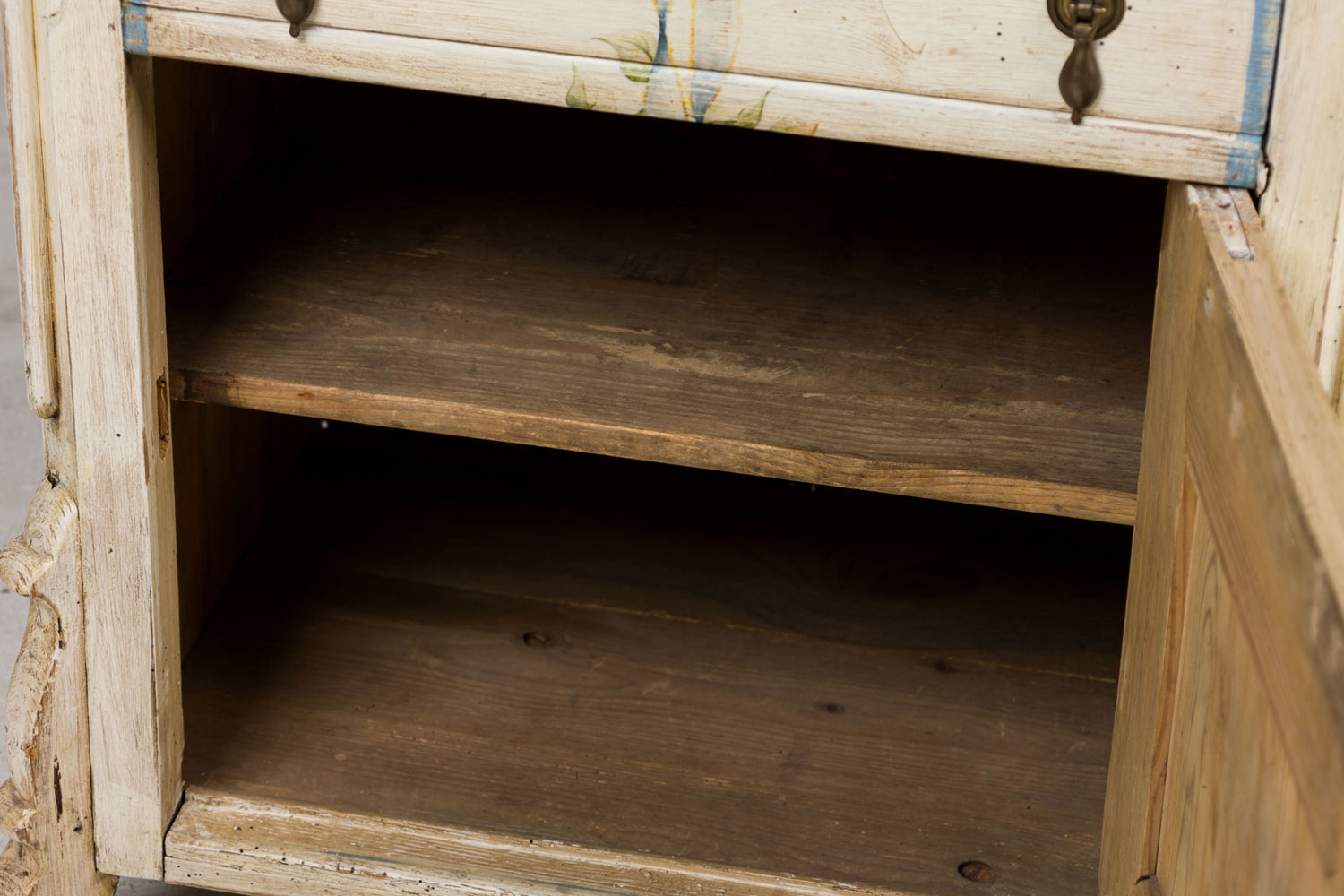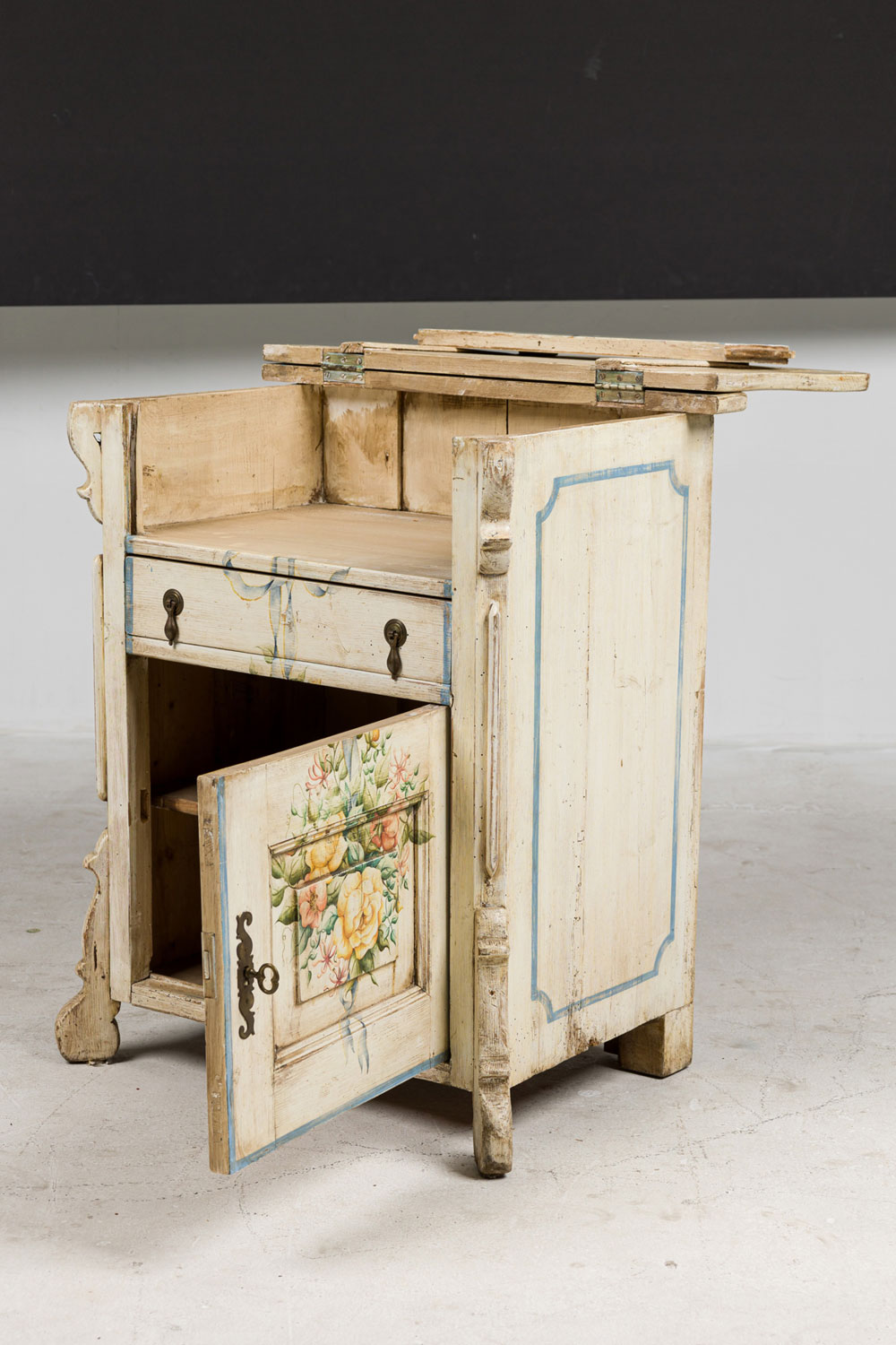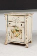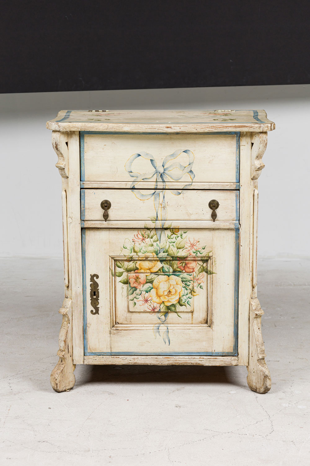 English Country (19/20th Century) off-white painted bedside commode havingf a floral design.with a flip top revealing an open shelf above a drawer and a lower door