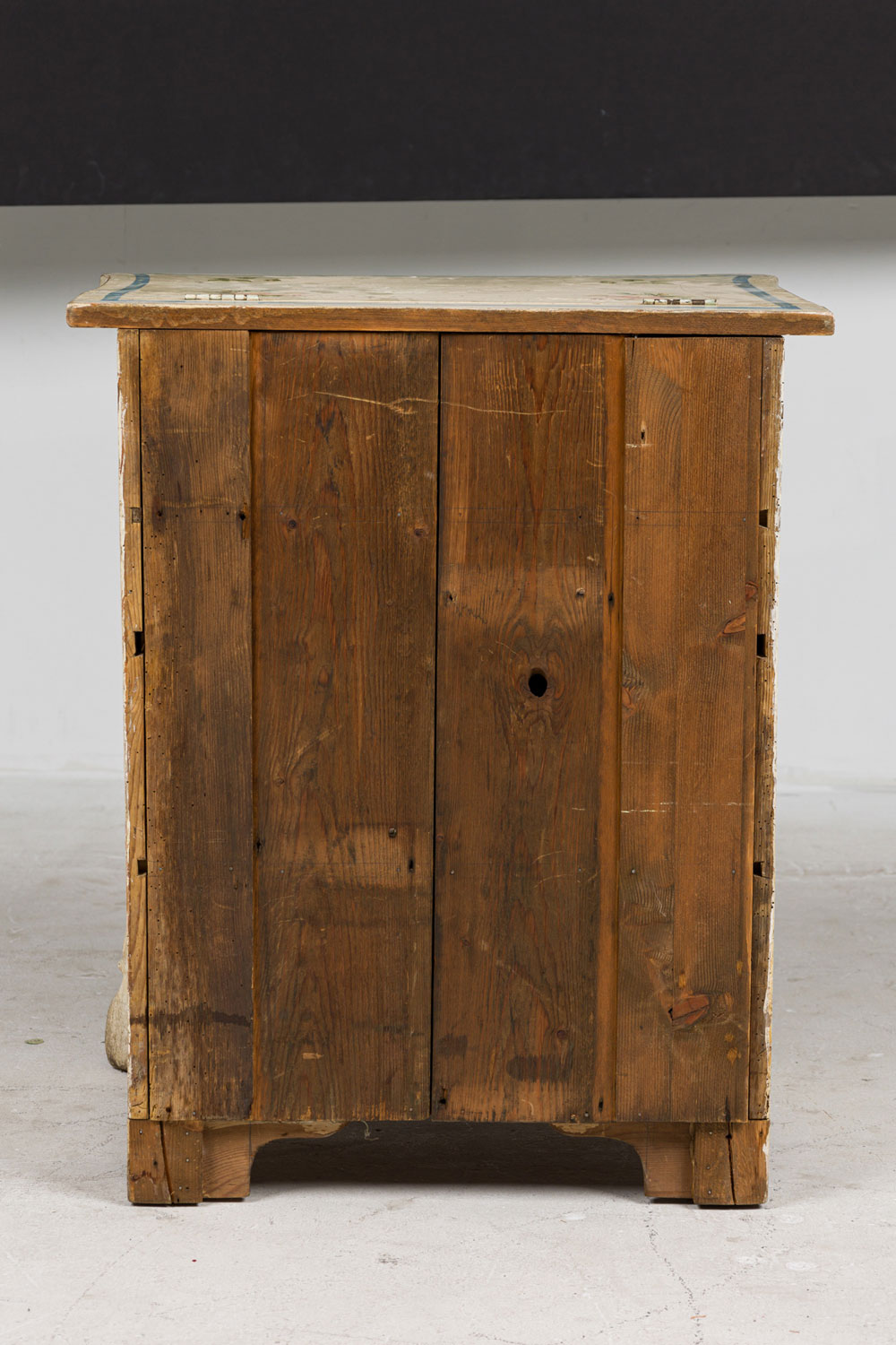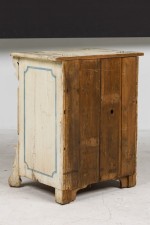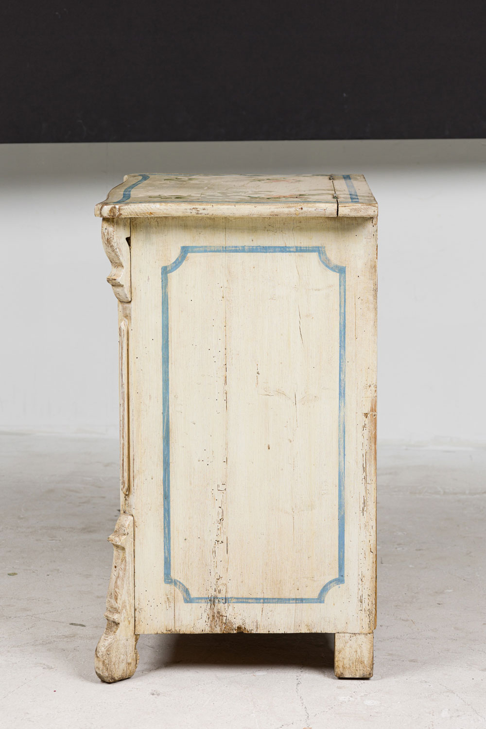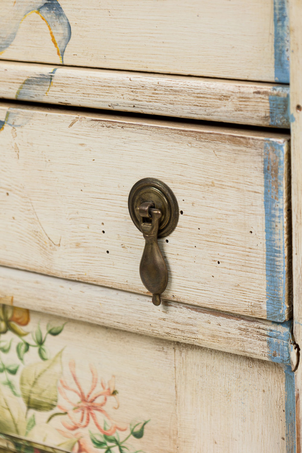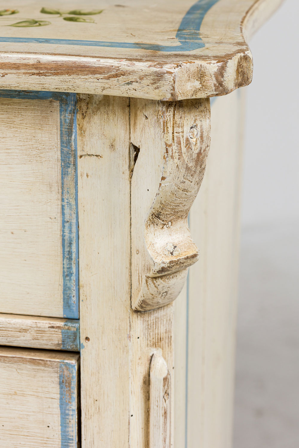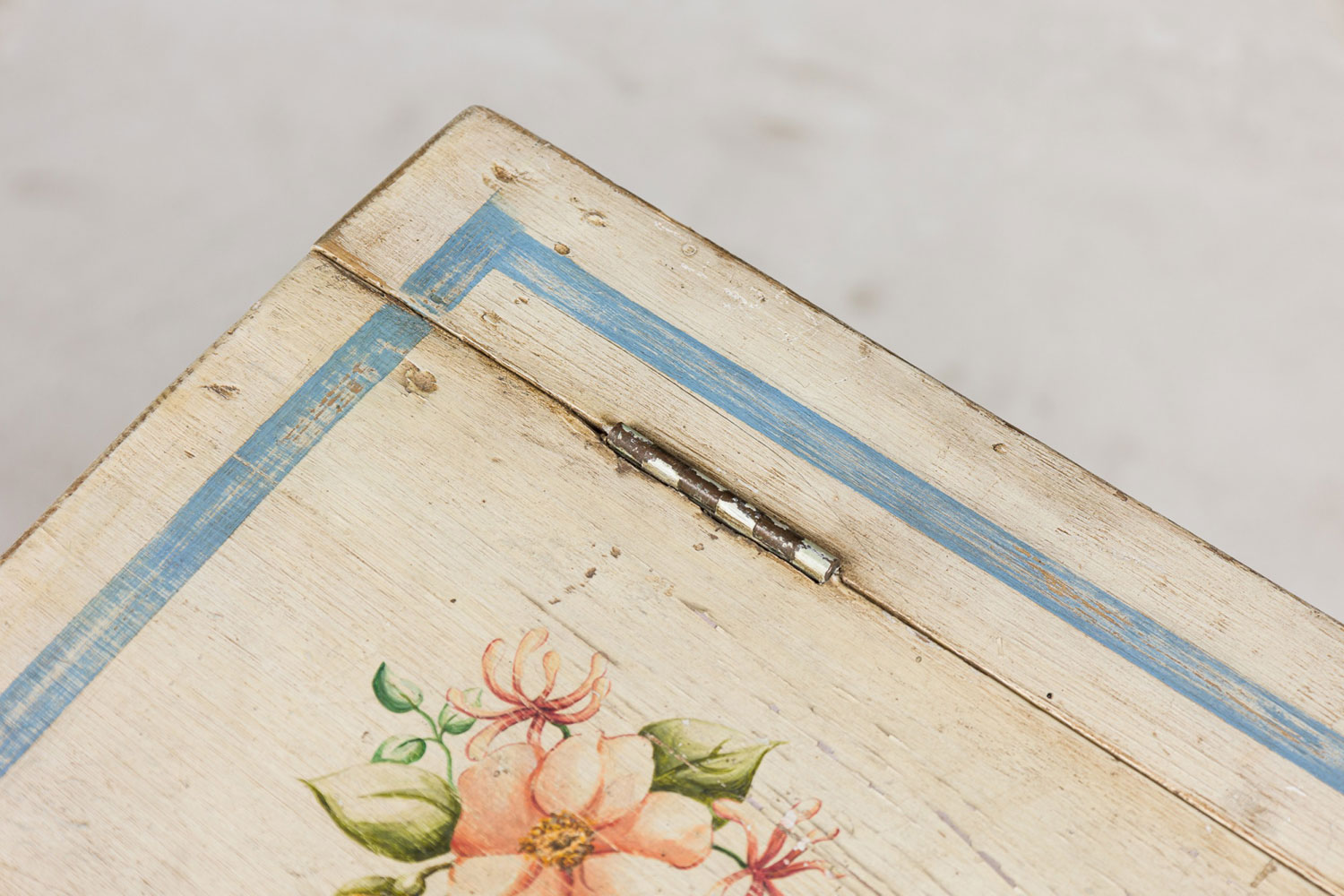 English Country (19/20th Century) off-white painted bedside commode havingf a floral design.with a flip top revealing an open shelf above a drawer and a lower door