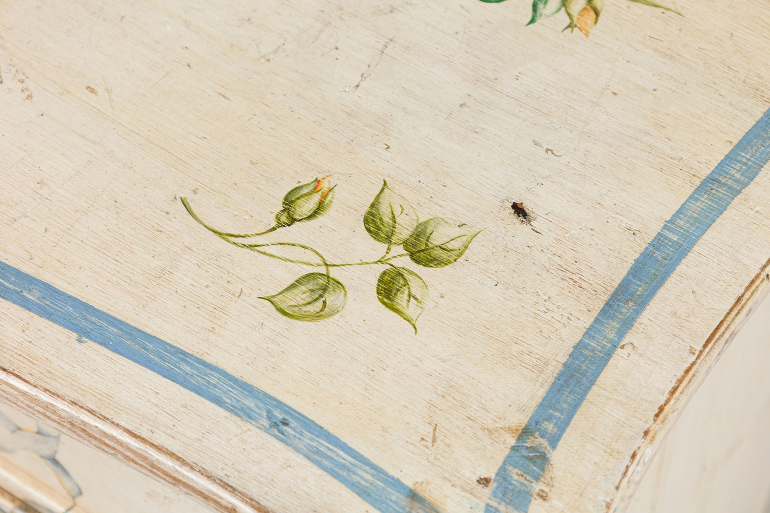 English Country (19/20th Century) off-white painted bedside commode havingf a floral design.with a flip top revealing an open shelf above a drawer and a lower door.